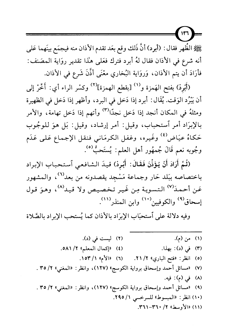 (ثُمَّ أَرَادَ أَنْ يُؤَذِّنَ فَقَالَ: أَبْرِدْ) قيدَ الشافعي استحباب الإبراد باختصاصه ببَلد حَار وجماعة مَسْجِد يقصدونه من بعد (¬6)، والمشهور عَن أحمدَ (¬7) التسوية مِن غَير تخصيص ولا قيد (¬8)، وهوَ قول إسحاق (¬9) والكوفيين (¬10) وابن المنذر (¬11).