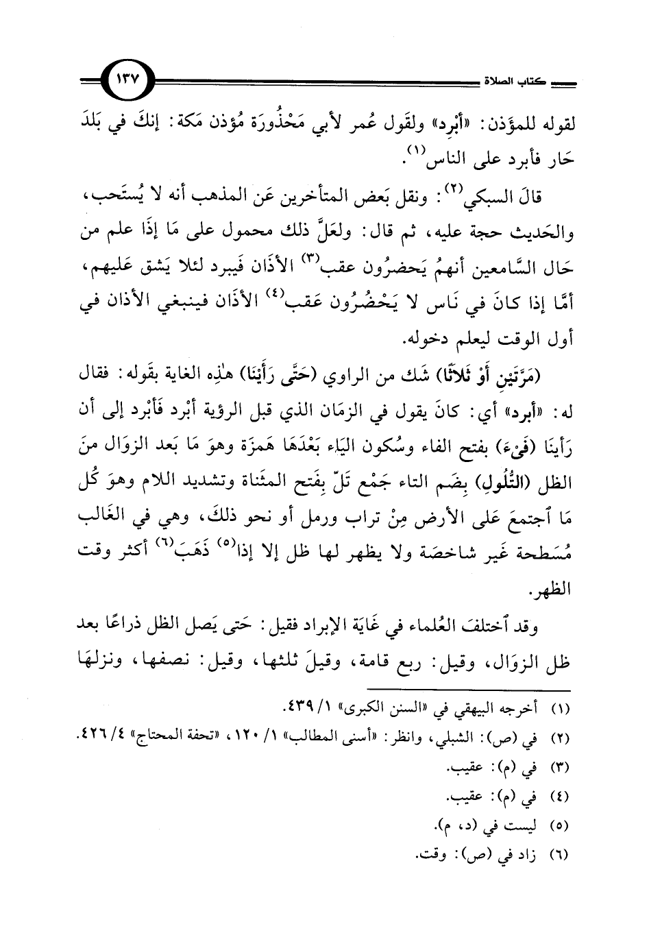 قالَ السبكي (¬2): ونقل بَعض المتأخرين عَن المذهب أنه لا يُستَحب، والحَديث حجة عليه، ثم قال: ولعَلَّ ذلك محمول على مَا إذَا علم من حَال السَّامعين أنهمُ يَحضرُون عقب (¬3) الأذَان فَيبرد لئلا يَشق عَليهم، أمَّا إذا كانَ في نَاس لا يَحْضُرُون عَقب (¬4) الأذَان فينبغي الأذان في أول الوقت ليعلم دخوله.