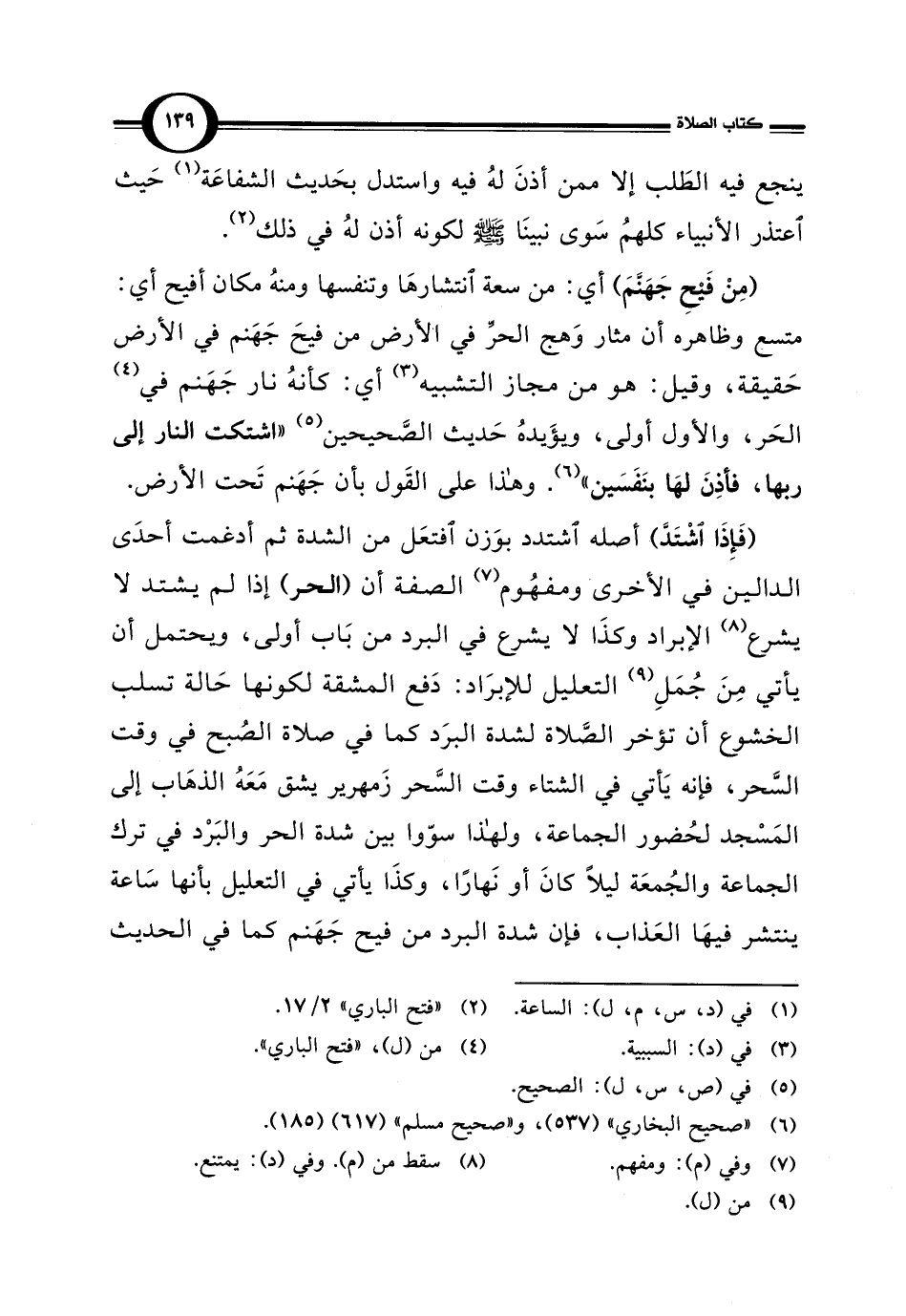 (مِنْ فَيْحِ جَهَنَّمَ) أي: من سعة انتشارهَا وتنفسها ومنهُ مكان أفيح أي: متسع وظاهره أن مثار وَهج الحرِّ في الأرض من فيحَ جَهَنم في الأرض حَقيقة، وقيل: هو من مجاز التشبيه (¬3) أي: كأنهُ نار جَهَنم في (¬4) الحَر، والأول أولى، ويؤَيدهُ حَديث الصَّحيحين (¬5) "اشتكت النار إلى ربها، فأذِنَ لهَا بنَفَسَين" (¬6). وهذا على القَول بأن جَهَنم تَحت الأرض.
