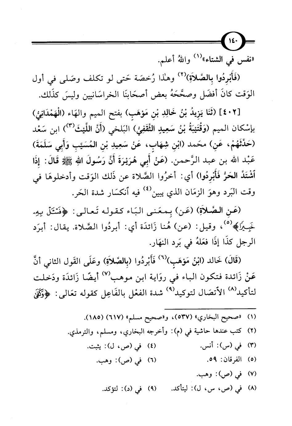 (قَالَ) خَالد (ابْنُ مَوْهَبٍ) (¬6) فَأَبْردُوا (بِالصَّلَاةِ) وعَلَى القَول الثاني أنَّ عَنْ زَائدة فتكون الباء في روَاية ابن موهب (¬7) أيضًا زَائدَة ودَخلت لتأكيد (¬8) الاتصَال لتوكيد (¬9) شدة الفعْل بالفَاعِل كقوله تعَالى: {وَكَفَى