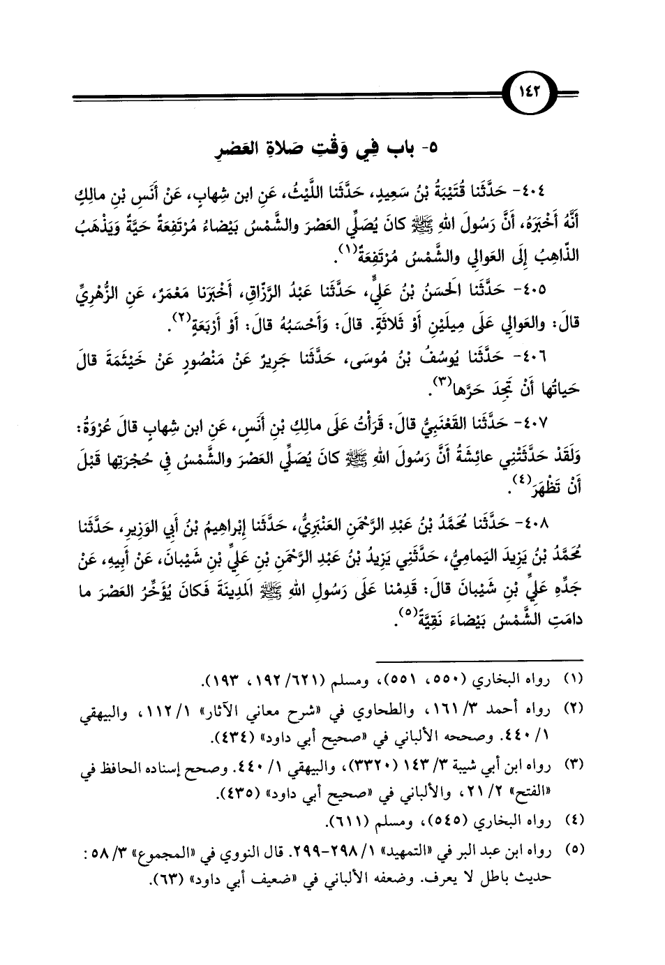 404 - حَدَّثَنا قُتَيْبَةُ بْنُ سَعِيدٍ، حَدَّثَنا اللَّيْثُ، عَنِ ابن شِهابٍ، عَنْ أَنَسِ بْنِ مالِكٍ أنَّهُ أَخْبَرَهُ، أَنَّ رَسُولَ اللهِ - صلى الله عليه وسلم - كانَ يُصَلِّي العَصْرَ والشَّمْسُ بَيْضاءُ مُرْتَفِعَة حَيَّة وَيَذْهَبُ الذّاهِبُ إِلَى العَوالِي والشَّمْسُ مُرتَفِعَةٌ (¬1).
