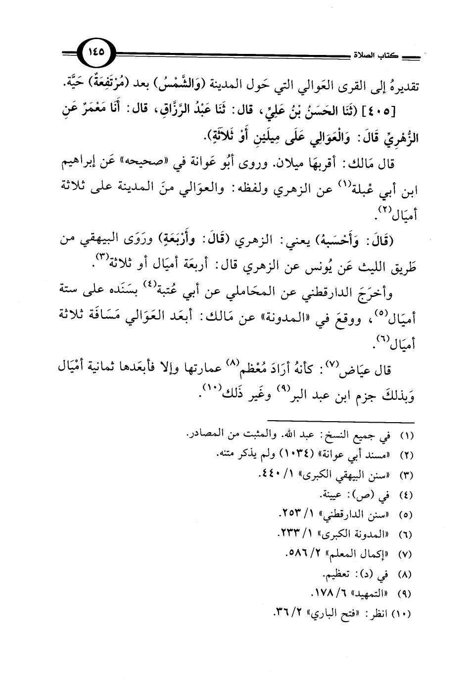[405] (ثَنَا الحَسَنُ بْنُ عَلِيٍّ، قال: ثَنَا عَبْدُ الرَّزَّاقِ، قال: أَنا مَعْمَرٌ عَنِ الزّهْرِيّ قَالَ: وَالْعَوَالِي عَلَى مِيلَينِ أَوْ ثَلاثةٍ).