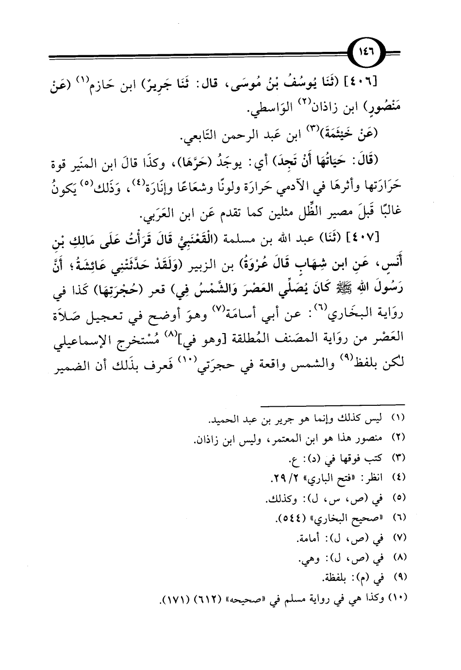 [406] (ثَنَا يُوسُفُ بْنُ مُوسَى، قال: ثَنَا جَرِيرٌ) ابن حَازم (¬1) (عَنْ مَنْصُورٍ) ابن زاذان (¬2) الوَاسطي.