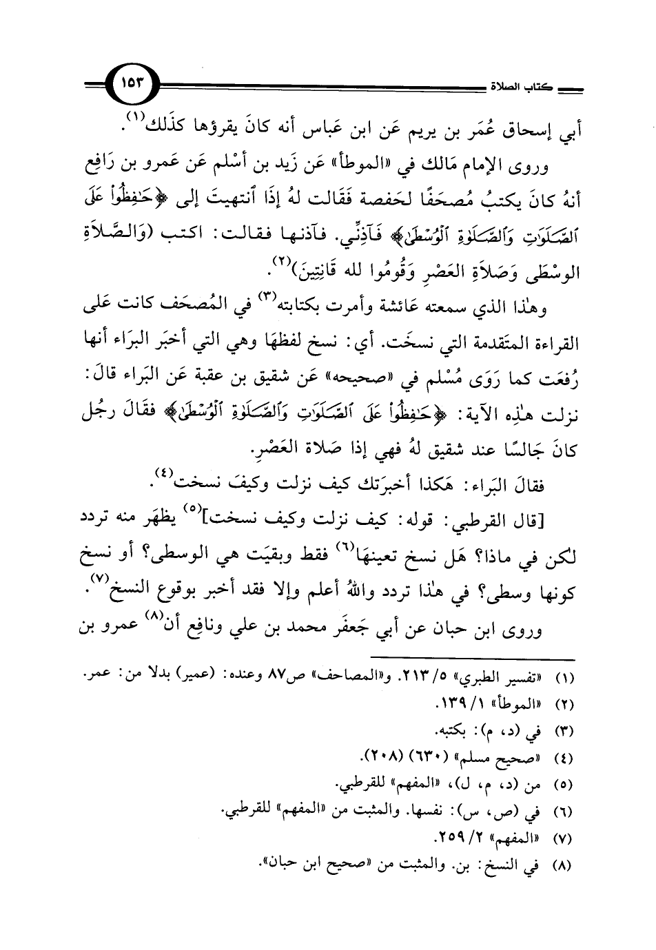 [قال القرطبي: قوله: كيف نزلت وكيف نسخت] (¬5) يظهَر منه تردد لكن في ماذا؟ هَل نسخ تعينهَا (¬6) فقط وبقيَت هي الوسطى؟ أو نسخ كونها وسطى؟ في هذا تردد واللهُ أعلم وإلا فقد أخبر بوقوع النسخ (¬7).
