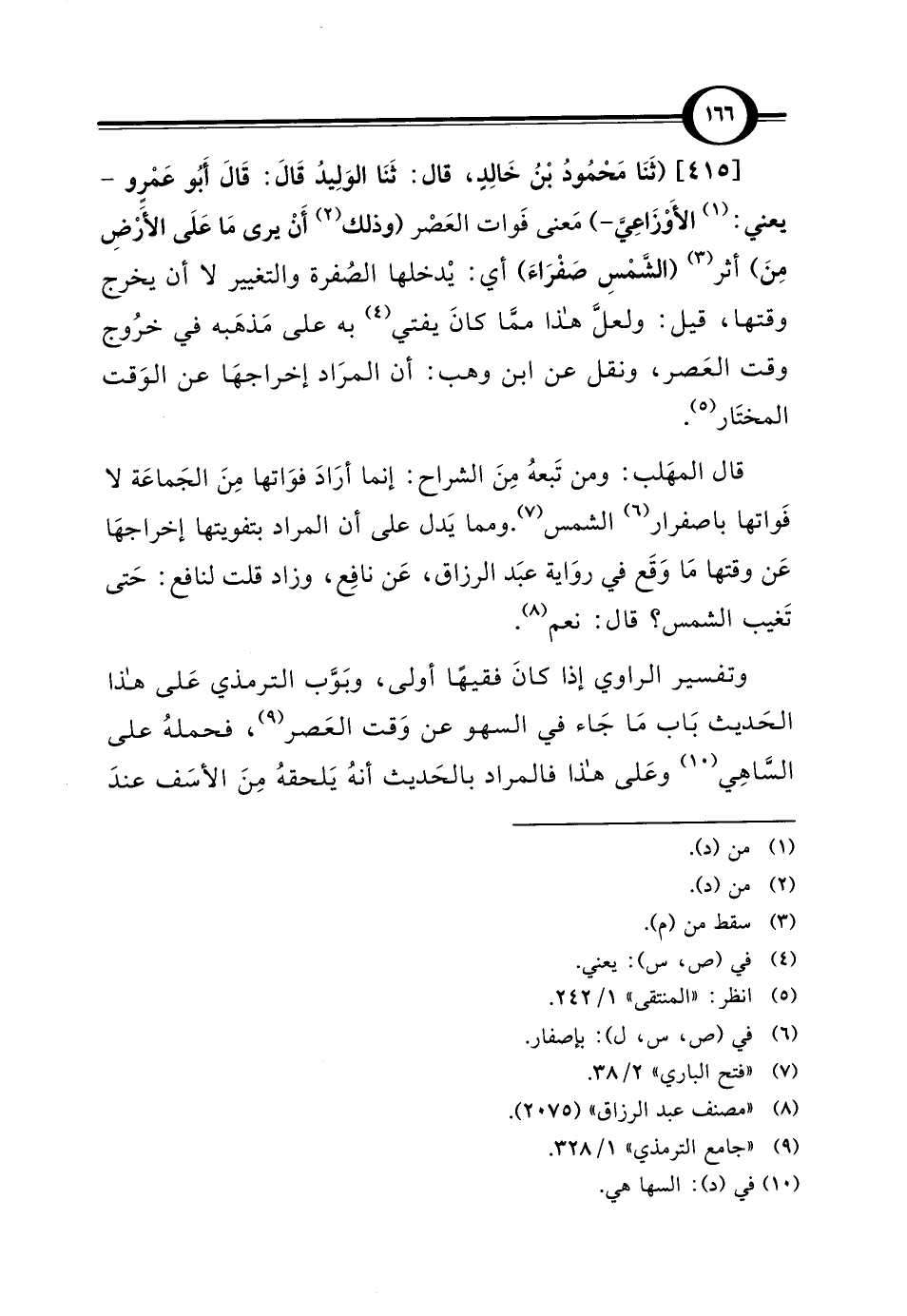 [415] (ثَنَا مَحْمُودُ بْنُ خَالِدٍ، قال: ثَنَا الوَلِيدُ قَالَ: قَالَ أَبُو عَمْرٍو -يعني: (¬1) الأوزَاعِيَّ-) مَعنى فَوات العَصْر (وذلك (¬2) أَنْ يرى مَا عَلَى الأرضِ مِنَ) أثر (¬3) (الشَّمْسِ صَفْرَاءَ) أي: يْدخلها الصُفرة والتغيير لا أن يخرج وقتها، قيل: ولعلَّ هذا ممَّا كانَ يفتي (¬4) به على مَذهَبه في خرُوج وقت العَصر، ونقل عن ابن وهب: أن المرَاد إخراجهَا عن الوَقت المختَار (¬5).
