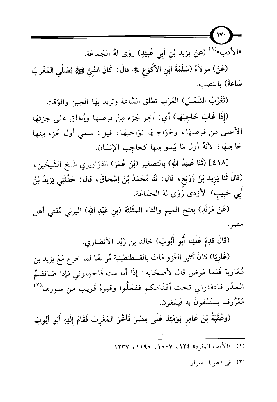 (وَعُقْبَةُ بْنُ عَامِرٍ يَوْمَئِذٍ عَلَى مِصْرَ فَأَخَّرَ المَغْرِبَ فَقَامَ إِلَيْهِ أَبُو أَيُّوبَ