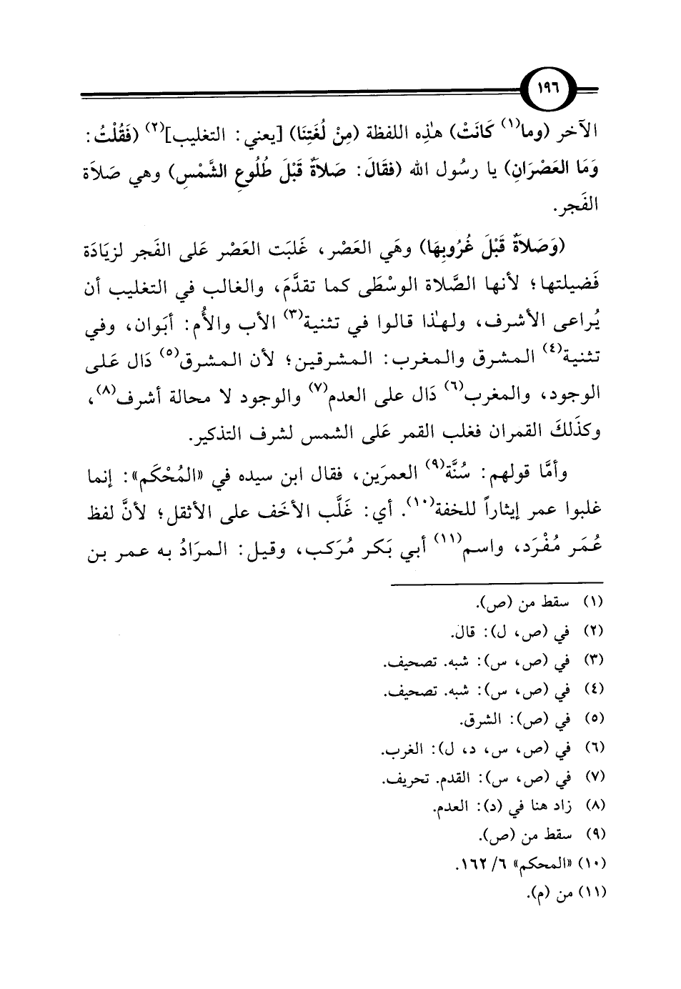الآخر (وما (¬1) كَانَتْ) هذِه اللفظة (مِنْ لُغَتِنَا) [يعني: التغليب] (¬2) (فَقُلْتُ: وَمَا العَصْرَانِ) يا رسُول الله (فقَالَ: صَلاةٌ قبْلَ طُلُوعِ الشَّمْسِ) وهي صَلَاة الفَجر.