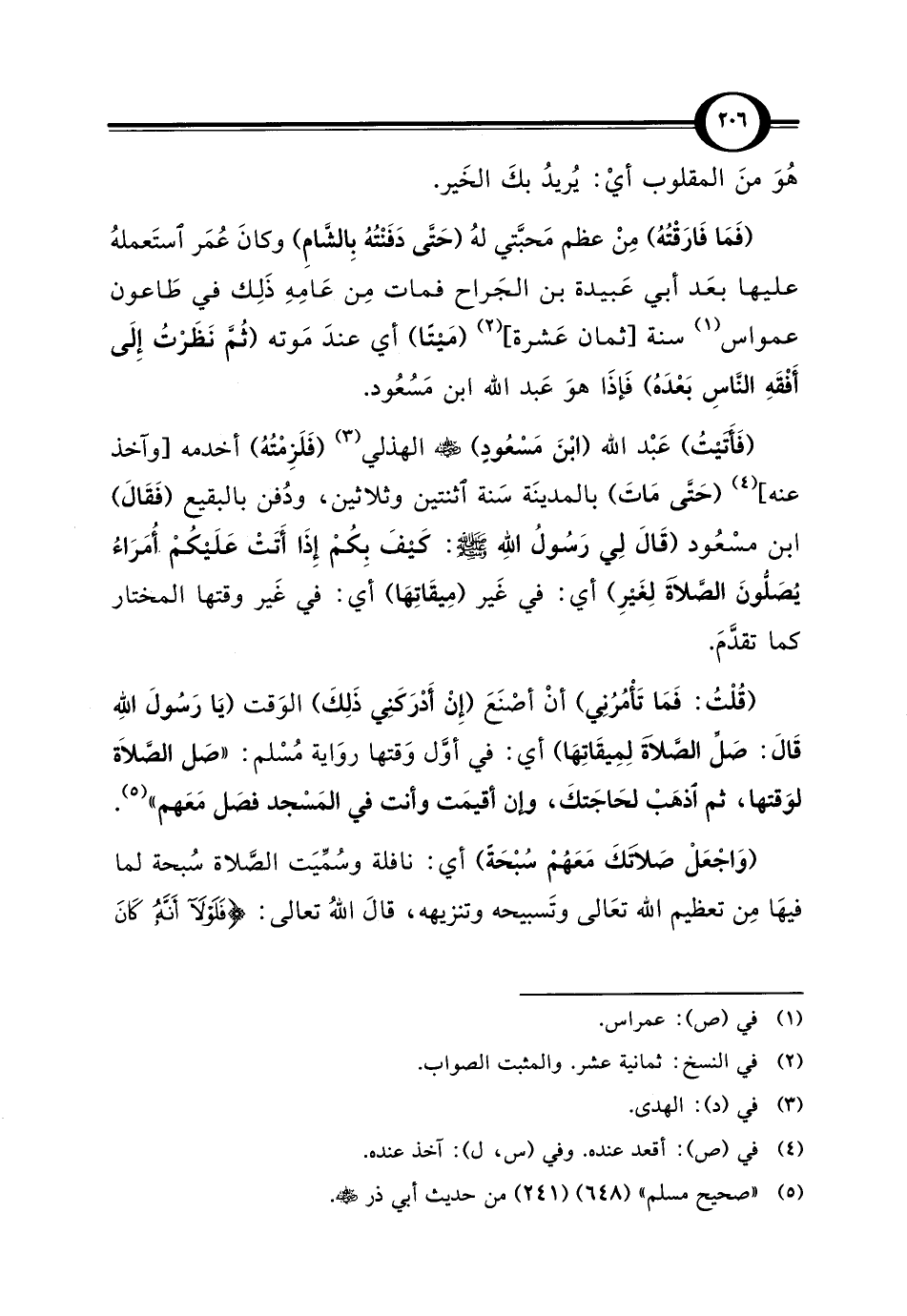 (فَأتَيتُ) عَبْد الله (ابْنَ مَسْعُودٍ) - رضي الله عنه - الهذلي (¬3) (فَلَزِمْتُهُ) أخدمه [وآخذ عنه] (¬4) (حَتَّى مَاتَ) بالمدينَة سَنة اثنتين وثلاثين، ودُفن بالبقيع (فَقَالَ) ابن مسْعُود (قَالَ لِي رَسُولُ الله - صلى الله عليه وسلم -: كيفَ بِكُمْ إِذَا أَتَتْ عَلَيكُمْ أُمَرَاءُ يُصَلُّونَ الصَّلَاة لِغَيرِ) أي: في غَير (مِيقَاتِهَا) أي: في غَير وقتها المختار كما تقدَّمَ.