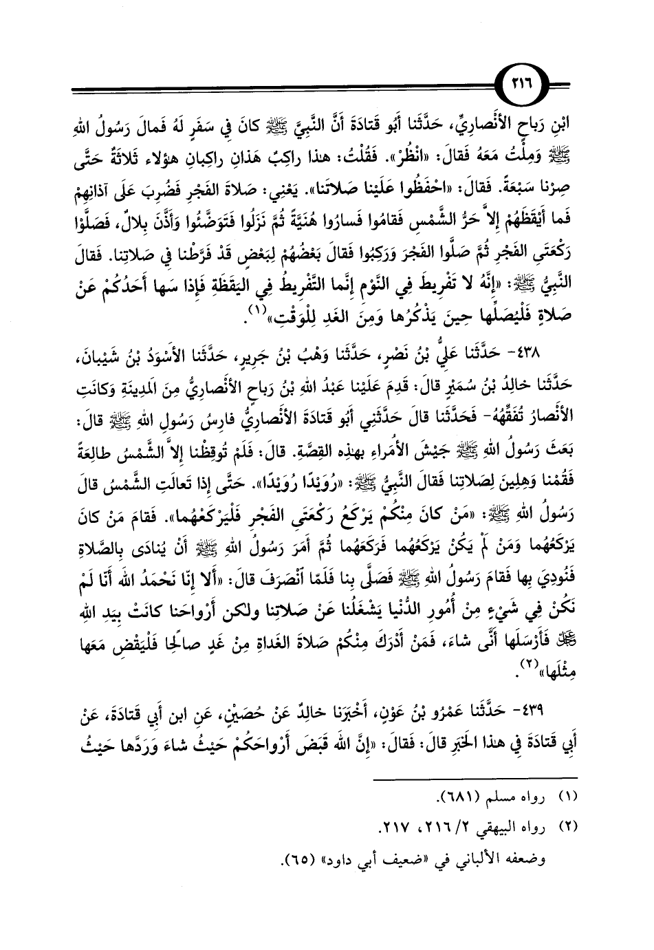 438 - حَدَّثَنا عَلِيُّ بْن نَصْرٍ، حَدَّثَنا وَهْبُ بْنُ جَرِيرٍ، حَدَّثَنا الأسوَدُ بْنُ شَيْبانَ، حَدَّثَنا خالِدُ بْن سُمَيْرٍ قالَ: قَدِمَ عَلَيْنا عَبْدُ اللهِ بْنُ رَباحٍ الأنصارِيُّ مِنَ المَدِينَةِ وَكانَتِ الأنصارُ تُفَقِّهُهُ -فَحَدَّثَنا قالَ حَدَّثَنِي أَبُو قَتادَةَ الأنصارِيُّ فارِسُ رَسُولِ اللهِ - صلى الله عليه وسلم - قالَ: بَعَثَ رَسُول اللهِ - صلى الله عليه وسلم - جيْشَ الأمَراءِ بهذِه القِصَّةِ. قالَ: فَلَمْ تُوقِظْنا إِلا الشَّمسُ طالِعَةً فَقُمْنا وَهِلِينَ لِصَلاتِنا فَقالَ النَّبِيُّ - صلى الله عليه وسلم -: "رُوَيْدًا رُوَيْدًا". حَتَّى إِذا تَعالَتِ الشَّمْسُ قالَ رَسُولُ اللهِ - صلى الله عليه وسلم -: "مَنْ كانَ مِنْكُمْ يَرْكَعُ رَكْعَتَي الفَجْرِ فَلْيَرْكعْهُما". فَقامَ مَنْ كانَ يَرْكَعُهُما وَمَنْ لَمْ يَكنْ يَرْكَعُهُما فَرَكَعَهُما ثمَّ أَمَرَ رَسُولُ اللهِ - صلى الله عليه وسلم - أَنْ يُنادَى بِالصَّلاةِ فَنُودِيَ بِها فَقامَ رَسُول اللهِ - صلى الله عليه وسلم - فَصَلَّى بِنا فَلَمّا انْصَرَفَ قالَ: "أَلا إِنّا نَحْمَدُ اللَّه أَنا لَمْ نَكُنْ فِي شَيءٍ مِنْ أُمُورِ الدُّنْيا يَشْغَلُنا عَنْ صَلاِتنا ولكن أَرْواحَنا كانَتْ بِيَدِ الله عز وجل فَأَرسَلَها أنَّى شاءَ، فَمَنْ أَدْرَكَ مِنْكُم صَلاةَ الغَداةِ مِنْ غَدٍ صالحًا فَلْيَقْضِ مَعَها مِثْلَها" (¬2).