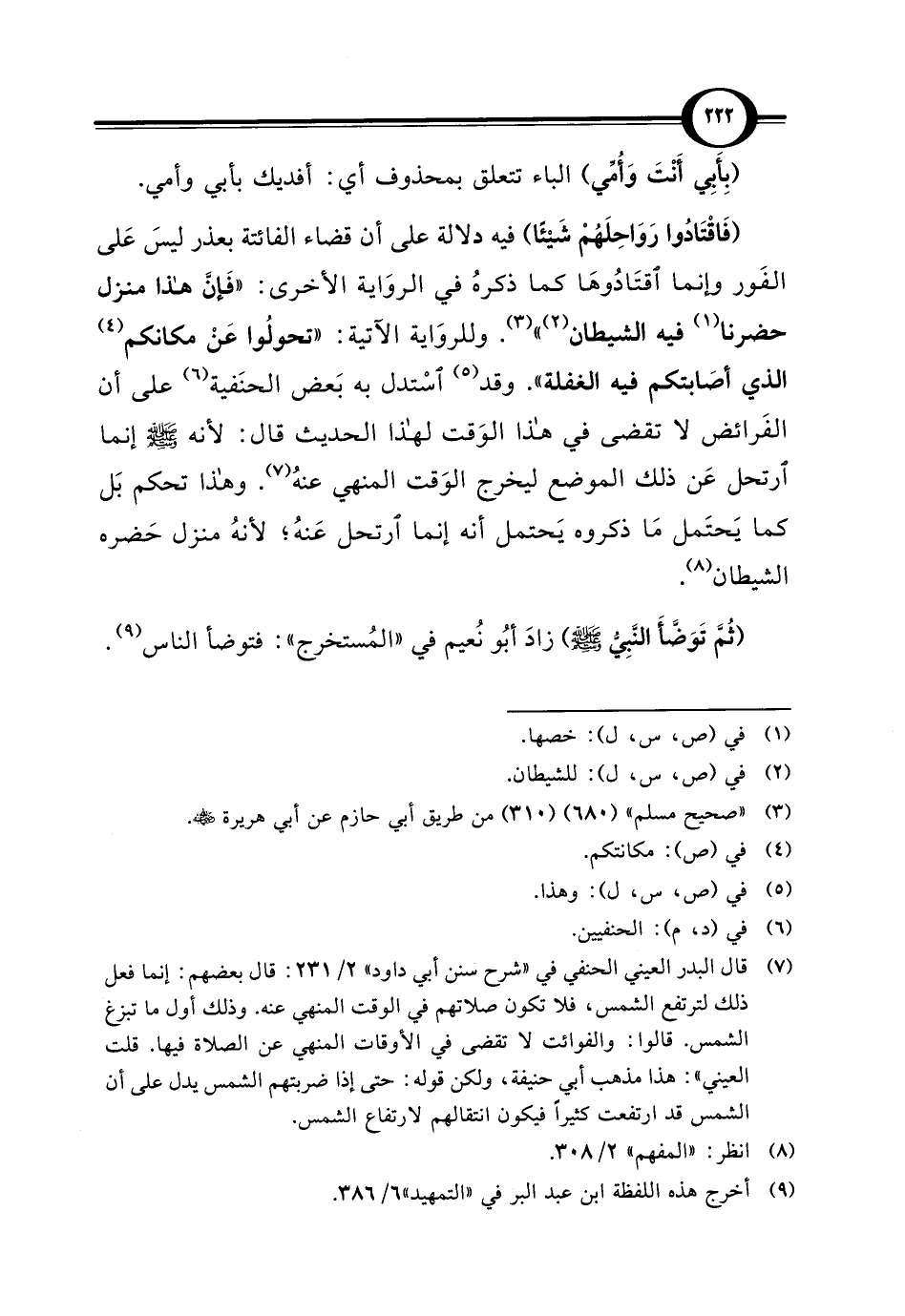 (فَاقْتَادُوا رَوَاحِلَهُمْ شَيئًا) فيه دلالة على أن قضاء الفائتة بعذر ليسَ عَلى الفَور وإنما اقتَادُوهَا كما ذكرهُ في الروَاية الأخرى: "فَإنَّ هذا منزل حضرنا (¬1) فيه الشيطان (¬2) " (¬3). وللروَاية الآتية: "تحولُوا عَنْ مكانكم (¬4) الذي أصَابتكم فيه الغفلة". وقد (¬5) اسْتدل به بَعض الحنَفية (¬6) على أن الفَرائض لا تقضى في هذا الوَقت لهذا الحديث قال: لأنه - صلى الله عليه وسلم - إنما ارتحل عَن ذلك الموضع ليخرج الوَقت المنهي عنهُ (¬7). وهذا تحكم بَل كما يَحتَمل مَا ذكروه يَحتمل أنه إنما ارتحل عَنهُ؛ لأنهُ منزل حَضره الشيطان (¬8).