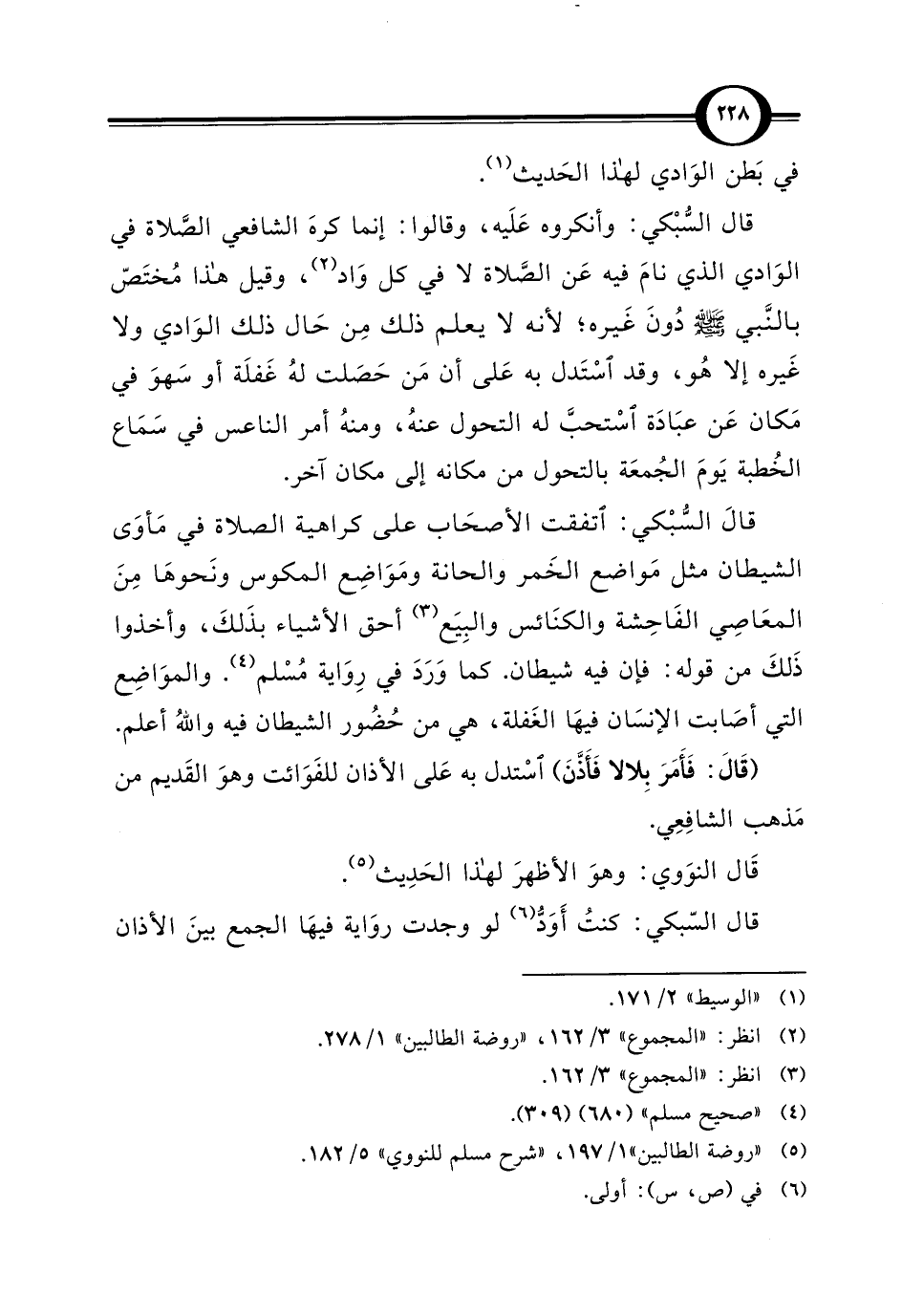قال السُّبْكي: وأنكروه عَلَيه، وقالوا: إنما كرهَ الشافعي الصَّلاة في الوَادي الذي نامَ فيه عَن الصَّلاة لا في كل وَاد (¬2)، وقيل هذا مُختَصّ بالنَّبي - صلى الله عليه وسلم - دُونَ غَيره؛ لأنه لا يعلم ذلك مِن حَال ذلك الوَادي ولا غَيره إلا هُو، وقد اسْتَدل به عَلى أن مَن حَصَلت لهُ غَفلَة أو سَهوَ في مَكان عَن عبَادَة اسْتحبَّ له التحول عنهُ، ومنهُ أمر الناعس في سَمَاع الخُطبة يَومَ الجُمعَة بالتحول من مكانه إلى مكان آخر.