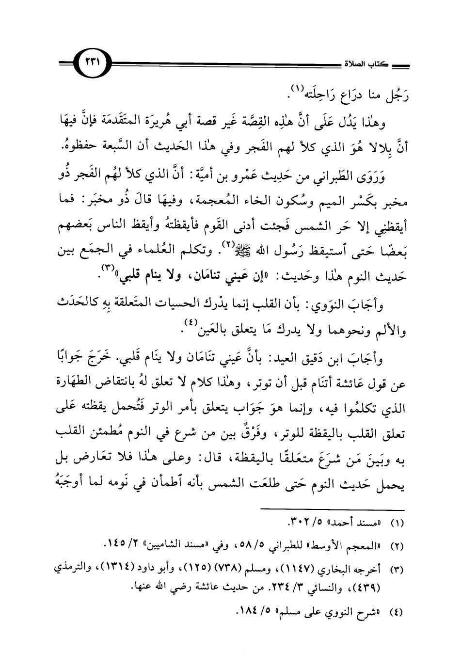 وَرَوَى الطبراني من حَدِيث عَمْرو بن أميَّة: أنَّ الذي كلأ لهُم الفَجر ذُو مخبر بكَسْر الميم وسُكون الخاء المُعجمة، وفيهَا قالَ ذُو مخبَر: فما أيقظنِي إلا حَر الشمس فَجئت أدنى القَوم فأيقظتهُ وأيقظ الناس بَعضهم بَعضًا حَتى استيقظ رَسُول الله - صلى الله عليه وسلم - (¬2). وتكلم العُلماء في الجَمع بين حَديث النوم هذا وحَديث: "إن عَيني تنامَان، ولا ينام قلبي" (¬3).