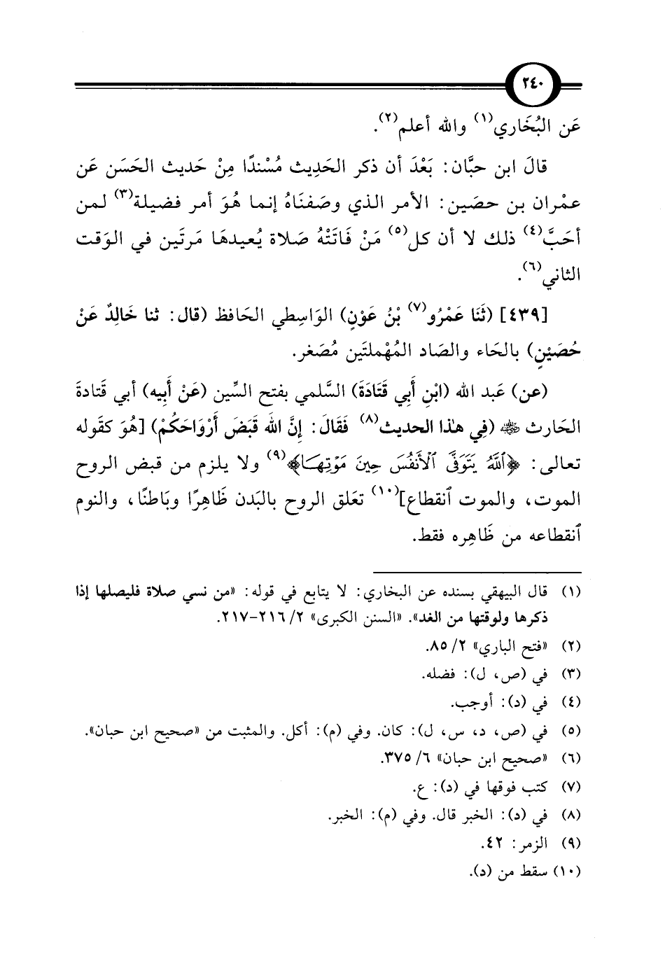 قالَ ابن حبَّان: بَعْدَ أن ذكر الحَدِيث مُسْندًا مِنْ حَديث الحَسَن عَن عمْران بن حصَين: الأمر الذي وصَفنَاهُ إنما هُوَ أمر فضيلة (¬3) لمن أحَبَّ (¬4) ذلك لا أن كل (¬5) مَنْ فَاتَتْهُ صَلاة يُعيدهَا مَرتَين في الوَقت الثاني (¬6).