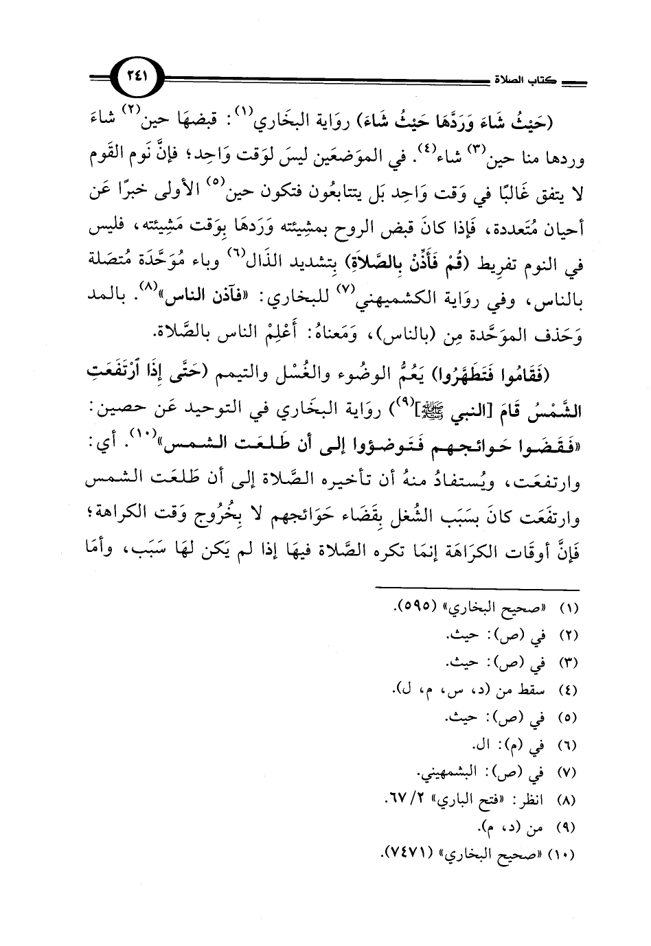 (حَيثُ شَاءَ وَرَدَّهَا حَيثُ شَاءَ) روَاية البخَاري (¬1): قبضهَا حين (¬2) شاءَ وردها منا حين (¬3) شاء (¬4). في الموَضعَين ليسَ لوَقت وَاحِد؛ فإنَّ نَوم القَوم لا يتفق غَالبًا في وَقت وَاحِد بَل يتتابعُون فتكون حين (¬5) الأولى خبرًا عَن أحيان مُتَعددة، فَإذا كانَ قبض الروح بمشِيئته وَرَدهَا بِوَقت مَشِيئته، فليس في النوم تفرِيط (قُمْ فَأَذِّنْ بِالصَّلَاةِ) بِتشديد الذَال (¬6) وباء مُوَحَّدَة مُتصلة بالناس، وفي روَاية الكشميهني (¬7) للبخاري: "فآذن الناس" (¬8). بالمد وَحَذف الموَحَّدة مِن (بالناس)، وَمَعناهُ: أَعْلِمْ الناس بالصَّلاة.