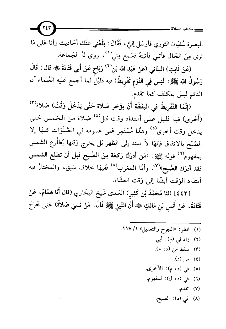 [422] (ثَنَا مُحَمَّدُ بْنُ كَثِير) العَبدي شَيخ البخَاري (قال أَنا هَمَّامٌ، عَنْ قَتَادَةَ، عَنْ أنسِ بْنِ مَالِكٍ - رضي الله عنه - أَنَّ النَّبِي - صلى الله عليه وسلم - قَالَ: مَنْ نَسِيَ صَلاة) حَتى خَرَجَ