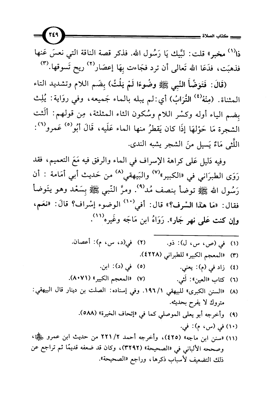 وفيه دَليل عَلى كراهة الإسراف في الماء والرفق فيه مَعَ التعميم، فقد رَوَى الطبرَاني في "الكبير" (¬7) والبَيهقي (¬8) من حَديث أبي أمَامة: أن رَسُول الله - صلى الله عليه وسلم - توضأ بنصف مُد (¬9). ومرَّ النّبي - صلى الله عليه وسلم - بِسَعْد وهو يتَوضأ فقال: "مَا هذا السَّرف؟ " قال: أفي (¬10) الوضوء إسْراف؟ قالَ: "نعَم، وإن كنت عَلى نهر جَار". رَوَاهُ ابن مَاجَه وغَيره (¬11).