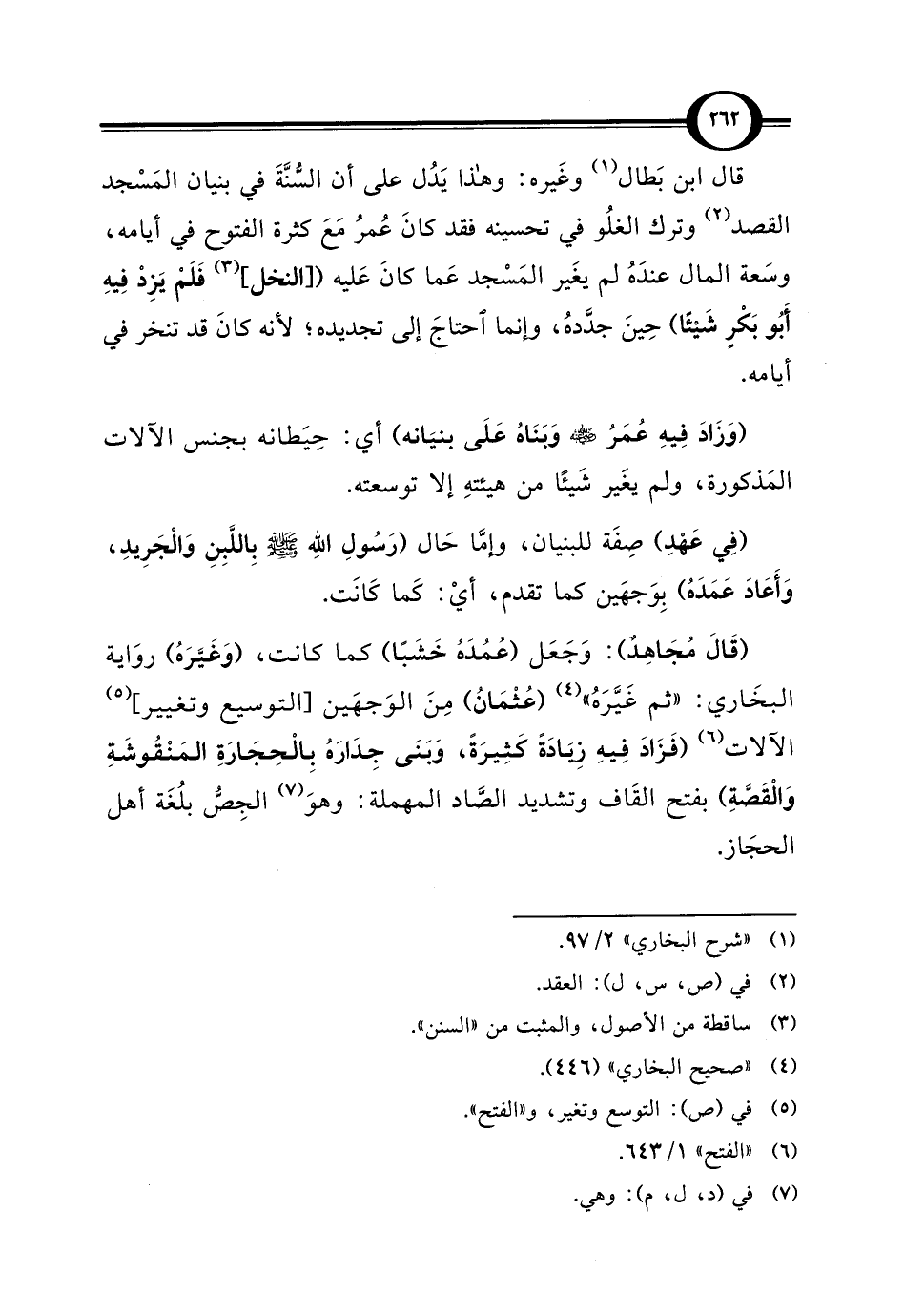 قال ابن بَطال (¬1) وغَيره: وهذا يَدُل على أن السُّنَّةَ في بنيان المَسْجد القصد (¬2) وترك الغلُو في تحسينه فقد كانَ عُمرُ مَعَ كثرة الفتوح في أيامه، وسَعة المال عندَهُ لم يغَير المَسْجد عَما كانَ عَليه ([النخل] (¬3) فَلَمْ يَزِدْ فِيهِ أَبُو بَكْرٍ شَيئًا) حِينَ جدَّدهُ، وإنما احتاجَ إلى تجديده؛ لأنه كانَ قد تنخر في أيامه.