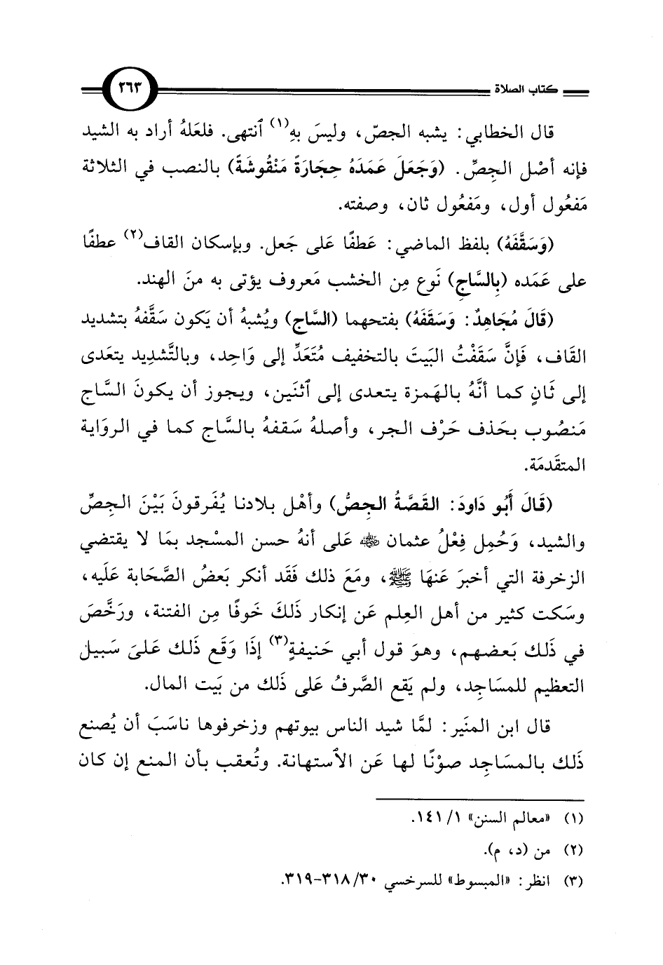 (قَالَ أَبُو دَاودَ: القَصَّةُ الجِصُّ) وأهْل بلادنا يُفَرقونَ بَيْنَ الجِصِّ والشيد، وَحُمِل فِعْلُ عثمان - صلى الله عليه وسلم - عَلى أنهُ حسن المسْجد بمَا لا يقتضي الزخرفة التي أخبرَ عَنهَا - صلى الله عليه وسلم -، ومَعَ ذلك فَقَد أنكر بَعضُ الصَّحَابة عَلَيه، وسَكت كثير من أهل العِلم عَن إنكار ذَلكَ خَوفًا مِن الفتنة، ورَخَّصَ في ذَلك بَعضهم، وهوَ قول أبي حَنيفةٍ (¬3) إذَا وَقَع ذَلك عَلىَ سَبيل التعظيم للمسَاجِد، ولم يَقع الصَّرفُ عَلى ذَلك من بَيت المال.