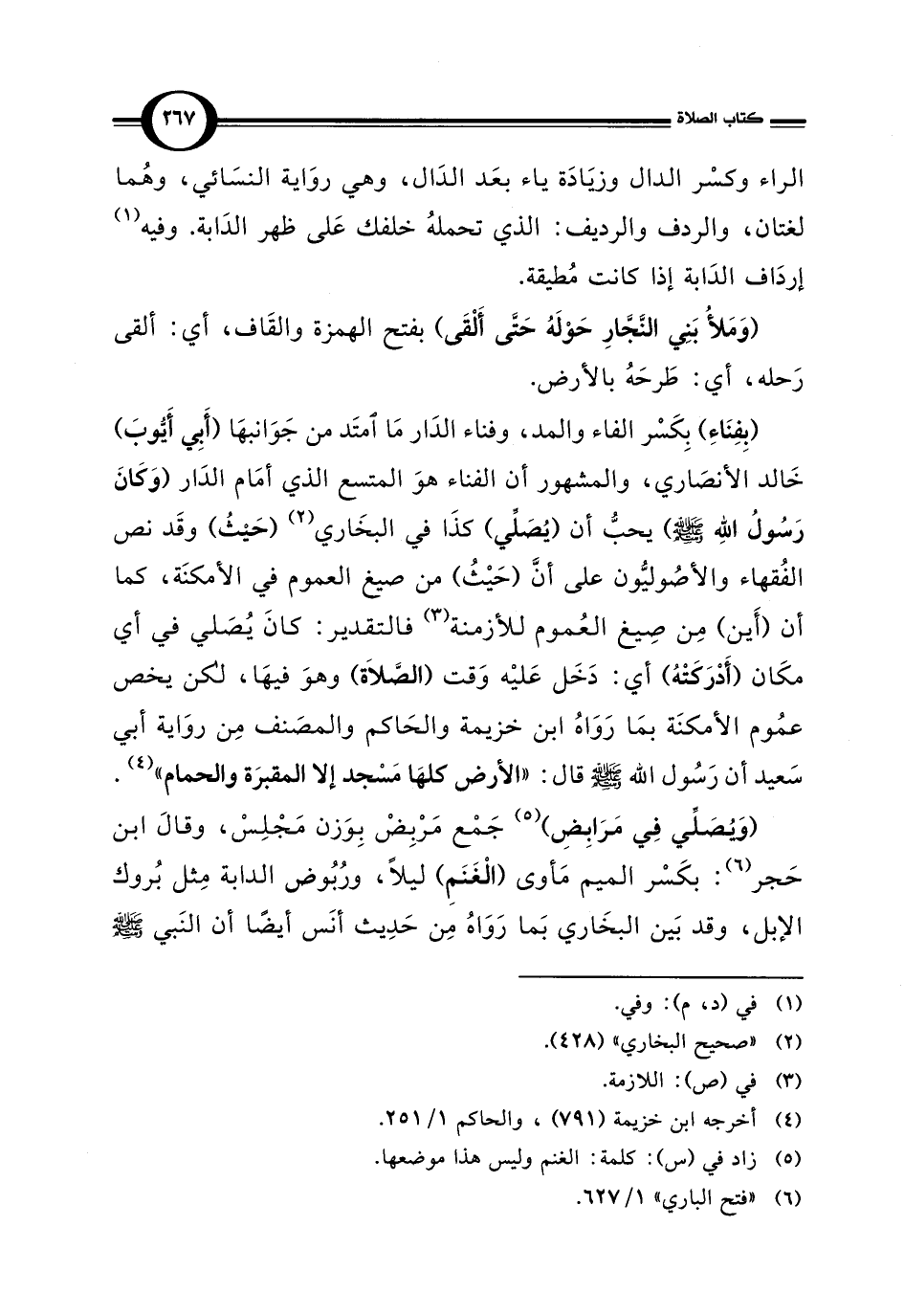 (بِفِنَاءِ) بِكَسْر الفاء والمد، وفناء الدَار مَا امتَد من جَوَانبهَا (أَبِي أَيُّوبَ) خَالد الأنصَاري، والمشهور أن الفناء هوَ المتسع الذي أمَام الدَار (وَكَانَ رَسُولُ الله - صلى الله عليه وسلم -) يحبُّ أن (يُصَلِّي) كذَا في البخَاري (¬2) (حَيثُ) وقَد نص الفُقهاء والأصُوليُّون على أنَّ (حَيْثُ) من صيغ العموم في الأمكنَة، كما أن (أَين) مِن صِيغ العُموم للأزمنة (¬3) فالتقدير: كانَ يُصَلي في أي مكَان (أَدْرَكتْهُ) أي: دَخَل عَليْه وَقت (الصَّلَاة) وهوَ فيهَا، لكن يخص عمُوم الأمكنَة بمَا رَوَاهُ ابن خزيمة والحَاكم والمصَنف مِن روَاية أبي سَعيد أن رَسُول الله - صلى الله عليه وسلم - قال: "الأرض كلهَا مَسْجد إلا المقبرَة والحمام" (¬4).