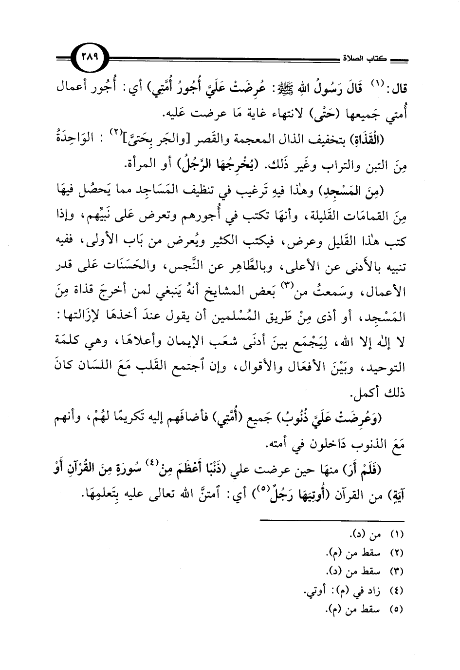 قال: (¬1) قَالَ رَسُولُ الله - صلى الله عليه وسلم -: عُرِضَتْ عَلَيَّ أُجُورُ أُمَّتِي) أي: أُجُور أعمال أُمتي جَميعها (حَتَّى) لانتهاء غاية مَا عرضت عَليه.