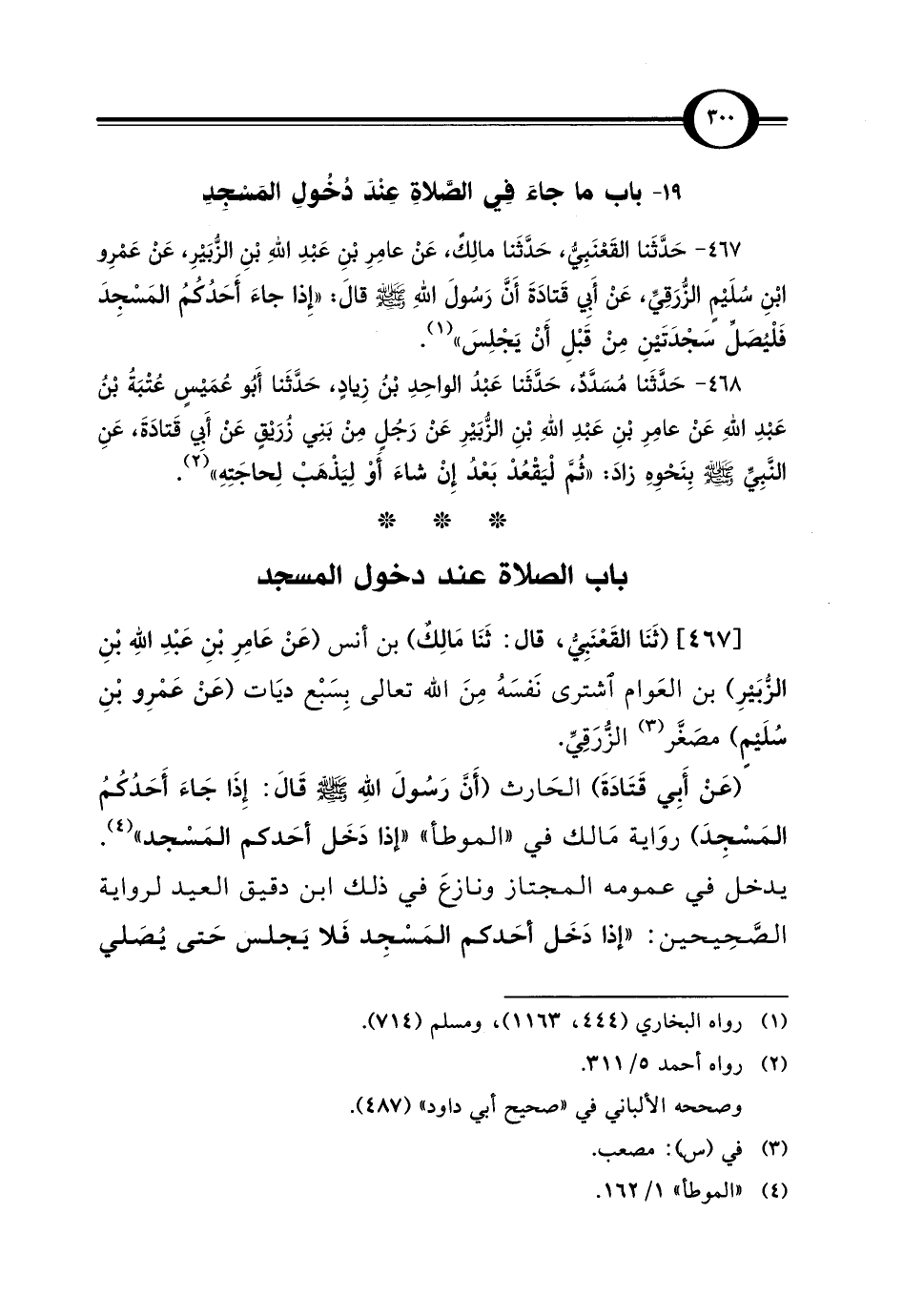 [467] (ثَنَا القَعْنَبِيُّ، قال: ثَنَا مَالِكٌ) بن أنس (عَنْ عَامِرِ بْنِ عَبْدِ اللهِ بْنِ الزُّبَيرِ) بن العَوام اشترى نَفسَهُ مِنَ الله تعالى بِسَبْع ديَات (عَنْ عَمْرِو بْنِ سُلَيمٍ) مصَغَّر (¬3) الزُّرَقِيِّ.