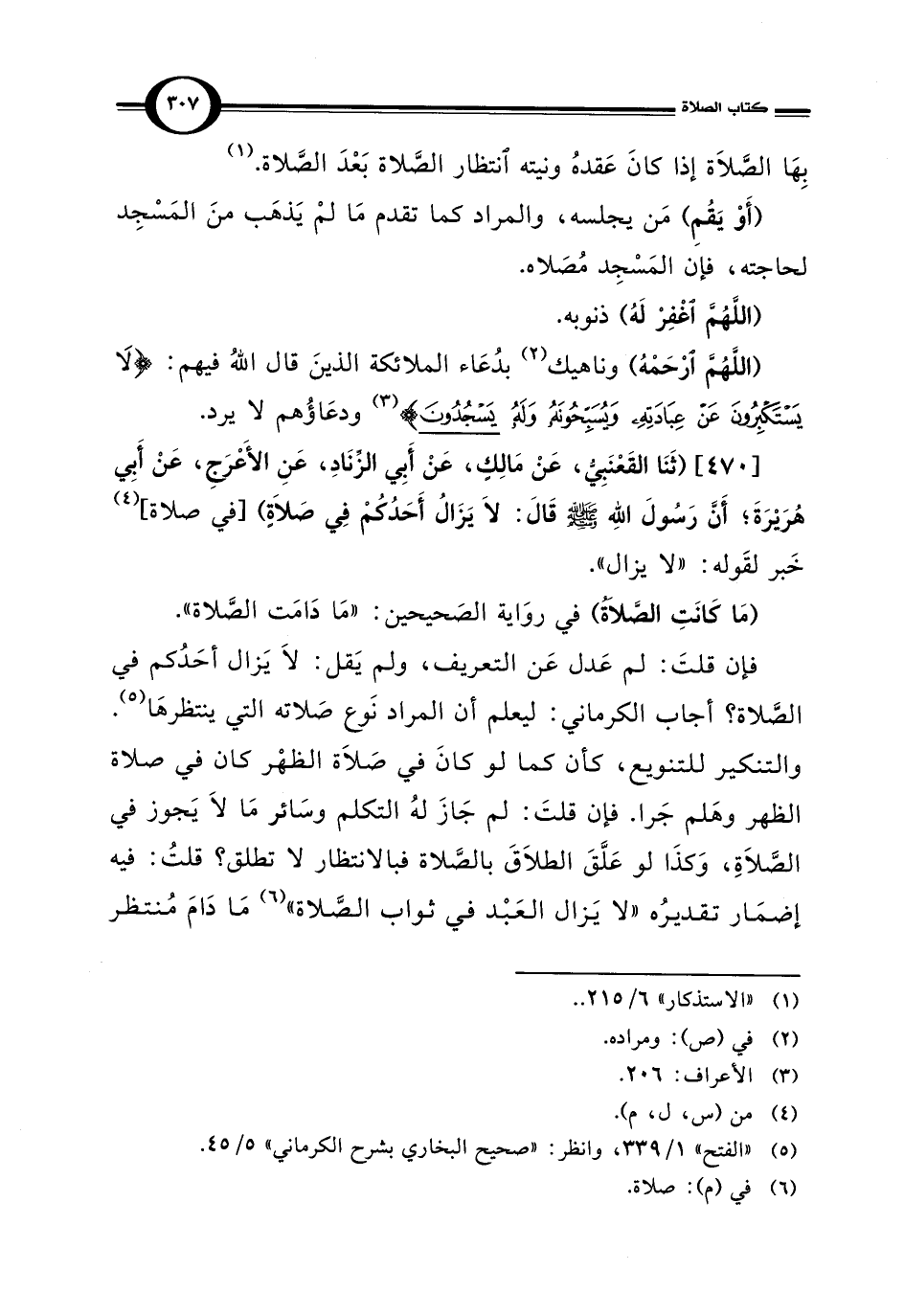 [470] (ثَنَا القَعْنَبِيُّ، عَنْ مَالِكٍ، عَنْ أَبِي الزنَادِ، عَنِ الأَعْرَجِ، عَنْ أَبِي هُرَيْرَةَ؛ أَنَّ رَسُولَ اللهِ - صلى الله عليه وسلم - قَالَ: لَا يَزَالُ أَحَدُكُمْ فِي صَلَاةٍ) [في صلاة] (¬4) خَبر لقَوله: "لا يزال".