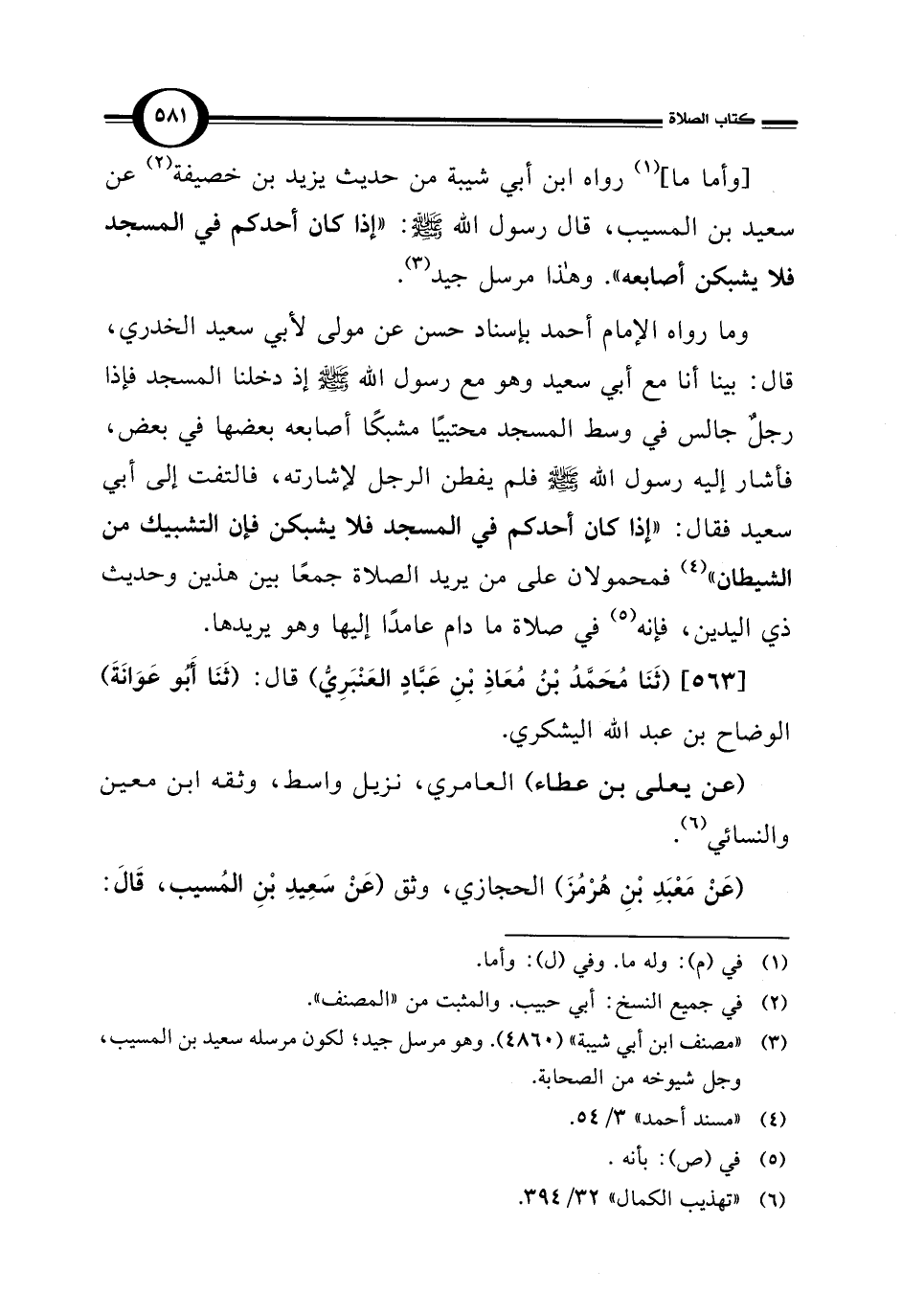 وما رواه الإمام أحمد بإسناد حسن عن مولى لأبي سعيد الخدري، قال: بينا أنا مع أبي سعيد وهو مع رسول الله - صلى الله عليه وسلم - إذ دخلنا المسجد فإذا رجلٌ جالس في وسط المسجد محتبيًا مشبكًا أصابعه بعضها في بعض، فأشار إليه رسول الله - صلى الله عليه وسلم - فلم يفطن الرجل لإشارته، فالتفت إلى أبي سعيد فقال: "إذا كان أحدكم في المسجد فلا يشبكن فإن التشبيك من الشيطان" (¬4) فمحمولان على من يريد الصلاة جمعًا بين هذين وحديث ذي اليدين، فإنه (¬5) في صلاة ما دام عامدًا إليها وهو يريدها.