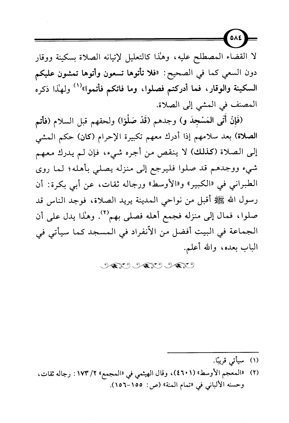 (فَإِنْ أَتَى المَسْجِدَ و) وجدهم (قَدْ صَلَّوْا) ولحقهم قبل السلام (فأتم الصلاة) بعد سلامهم إذا أدرك معهم تكبيرة الإحرام (كان) حكم المشي إلى الصلاة (كذلك) لا ينقص من أجره شيء، فإن لم يدرك معهم شيء ووجدهم قد صلوا فليرجع إلى منزله يصلي بأهله؛ لما روى الطبراني في "الكبير" و"الأوسط" ورجاله ثقات، عن أبي بكرة: أن رسول الله - صلى الله عليه وسلم - أقبل من نواحي المدينة يريد الصلاة، فوجد الناس قد صلوا، فمال إلى منزله فجمع أهله فصلى بهم (¬2). وهذا يدل على أن الجماعة في البيت أفضل من الانفراد في المسجد كما سيأتي في الباب بعده، والله أعلم.