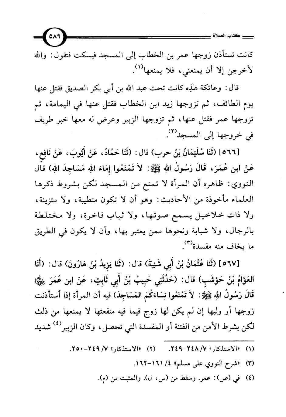 [566] (ثَنَا سُلَيمَانُ بْنُ حرب) قال: (ثَنَا حَمَّادٌ، عَنْ أَيُّوبَ، عَنْ نَافِعٍ، عَنْ ابن عُمَرَ، قَال رَسُولُ الله - صلى الله عليه وسلم -: لَا تَمْنَعُوا إِمَاءَ الله مَسَاجِدَ الله) قال النووي: ظاهره أن المرأة لا تمنع من المسجد لكن بشروط ذكرها العلماء مأخوذة من الأحاديث: وهو أن لا تكون متطيبة، ولا متزينة، ولا ذات خلاخيل يسمع صوتها، ولا ثياب فاخرة، ولا مختلطة بالرجال، ولا شبابة ونحوها ممن يعتبر بها، وأن لا يكون في الطريق ما يخاف منه مفسدة (¬3).