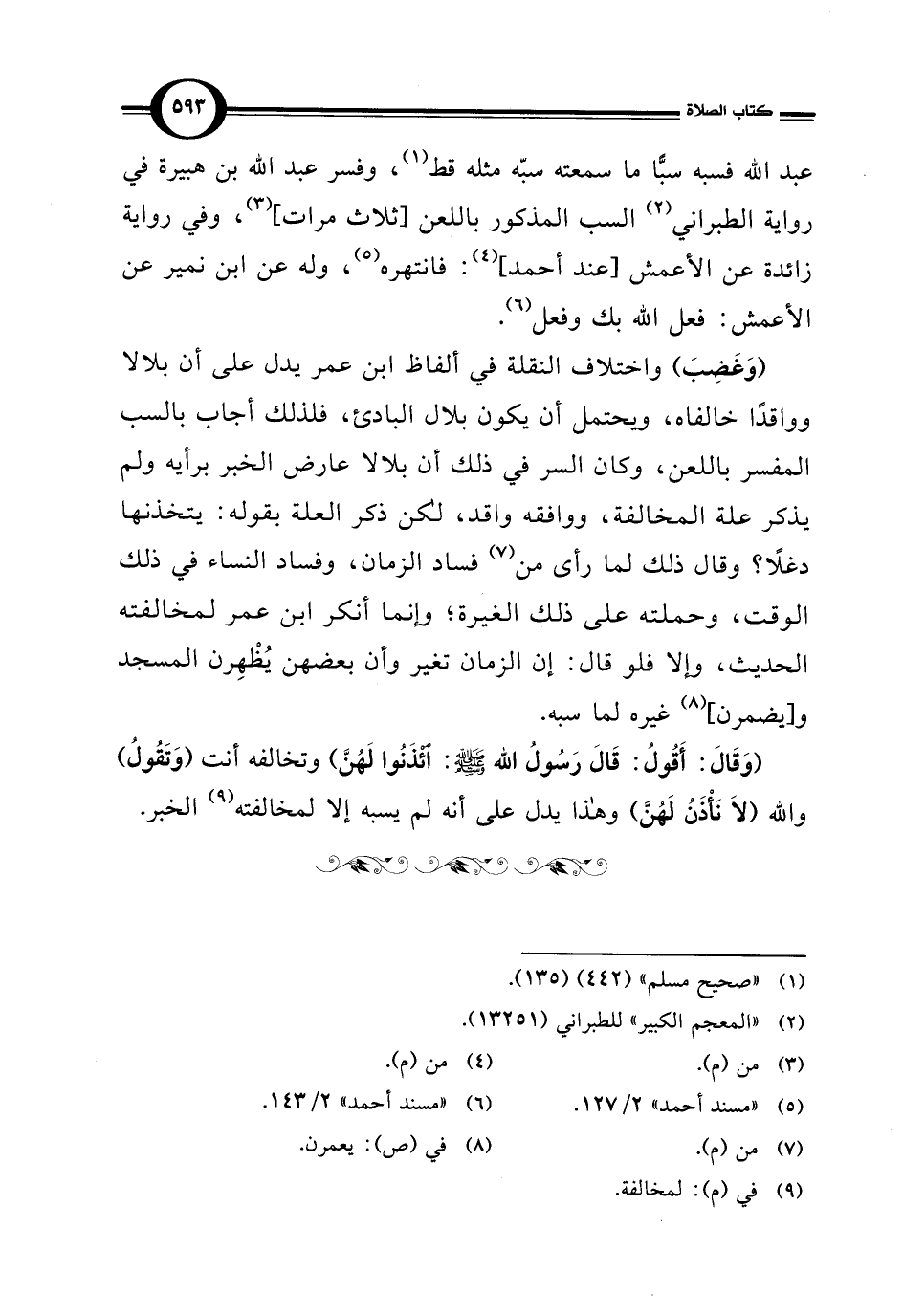 (وَغَضِبَ) واختلاف النقلة في ألفاظ ابن عمر يدل على أن بلالا وواقدًا خالفاه، ويحتمل أن يكون بلال البادئ، فلذلك أجاب بالسب المفسر باللعن، وكان السر في ذلك أن بلالا عارض الخبر برأيه ولم يذكر علة المخالفة، ووافقه واقد، لكن ذكر العلة بقوله: يتخذنها دغلًا؟ وقال ذلك لما رأى من (¬7) فساد الزمان، وفساد النساء في ذلك الوقت، وحملته على ذلك الغيرة؛ وإنما أنكر ابن عمر لمخالفته الحديث، وإلا فلو قال: إن الزمان تغير وأن بعضهن يُظْهِرن المسجد و [يضمرن] (¬8) غيره لما سبه.