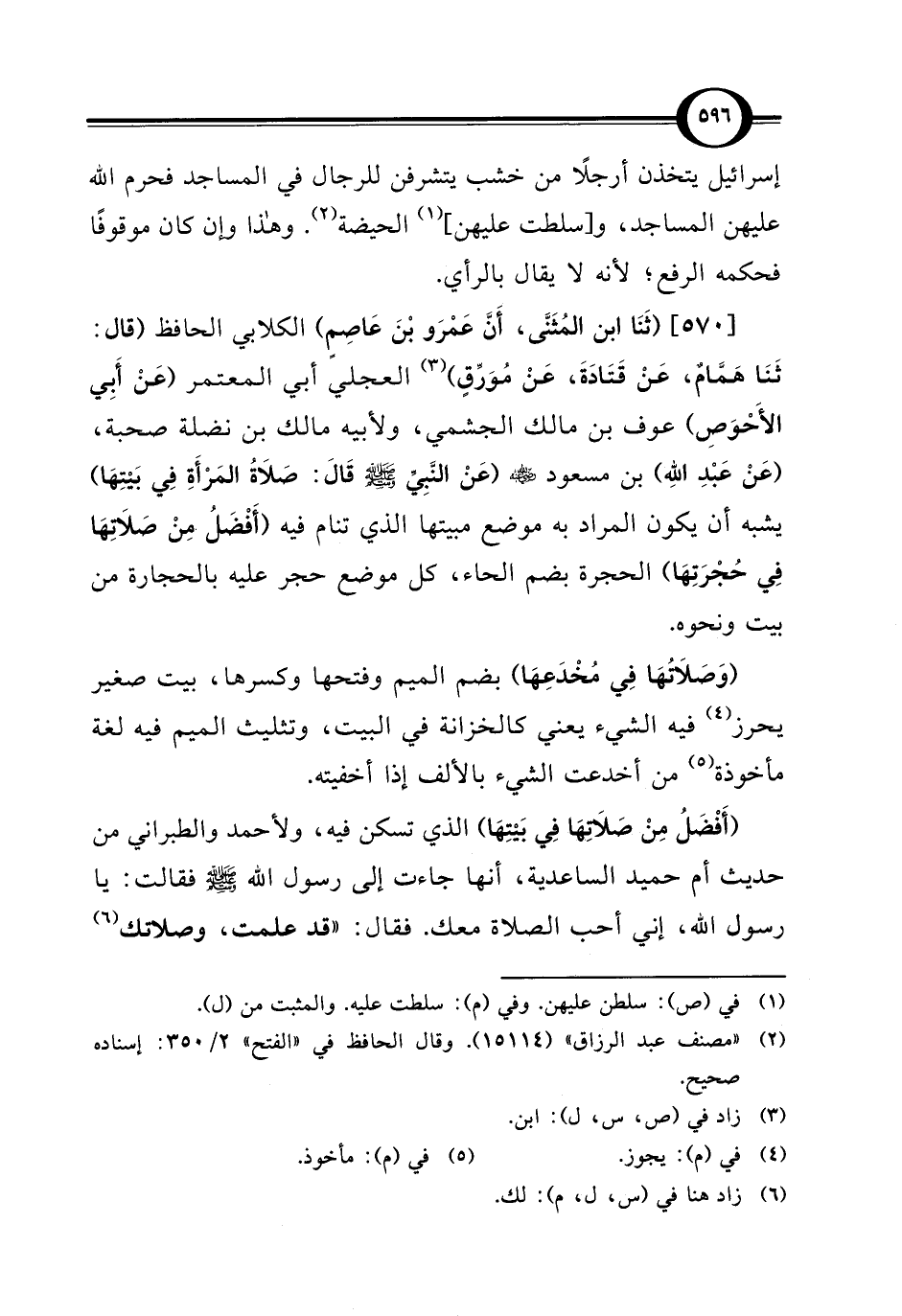 [570] (ثَنَا ابن المُثَنَّى، أَنَّ عَمْرَو بْنَ عَاصِمٍ) الكلابي الحافظ (قال: ثَنَا هَمَّامٌ، عَنْ قَتَادَةَ، عَنْ مُوَرِّقٍ) (¬3) العجلي أبي المعتمر (عَنْ أَبِي الأَحْوَصِ) عوف بن مالك الجشمي، ولأبيه مالك بن نضلة صحبة، (عَنْ عَبْدِ الله) بن مسعود - رضي الله عنه - (عَنْ النَّبِيِّ - صلى الله عليه وسلم - قَال: صَلَاةُ المَرْأَةِ فِي بَيْتِهَا) يشبه أن يكون المراد به موضع مبيتها الذي تنام فيه (أَفْضَلُ مِنْ صَلَاِتهَا فِي حُجْرَتِهَا) الحجرة بضم الحاء، كل موضع حجر عليه بالحجارة من بيت ونحوه.