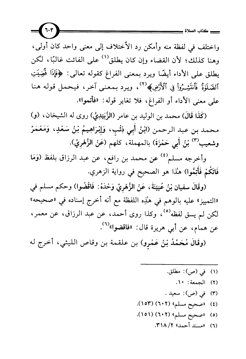 وأخرجه مسلم (¬4) عن محمد بن رافع، عن عبد الرزاق بلفظ (وَمَا فَاتَكُمْ فَأَتِمُّوا) هذا هو الصحيح في رواية الزهري.
