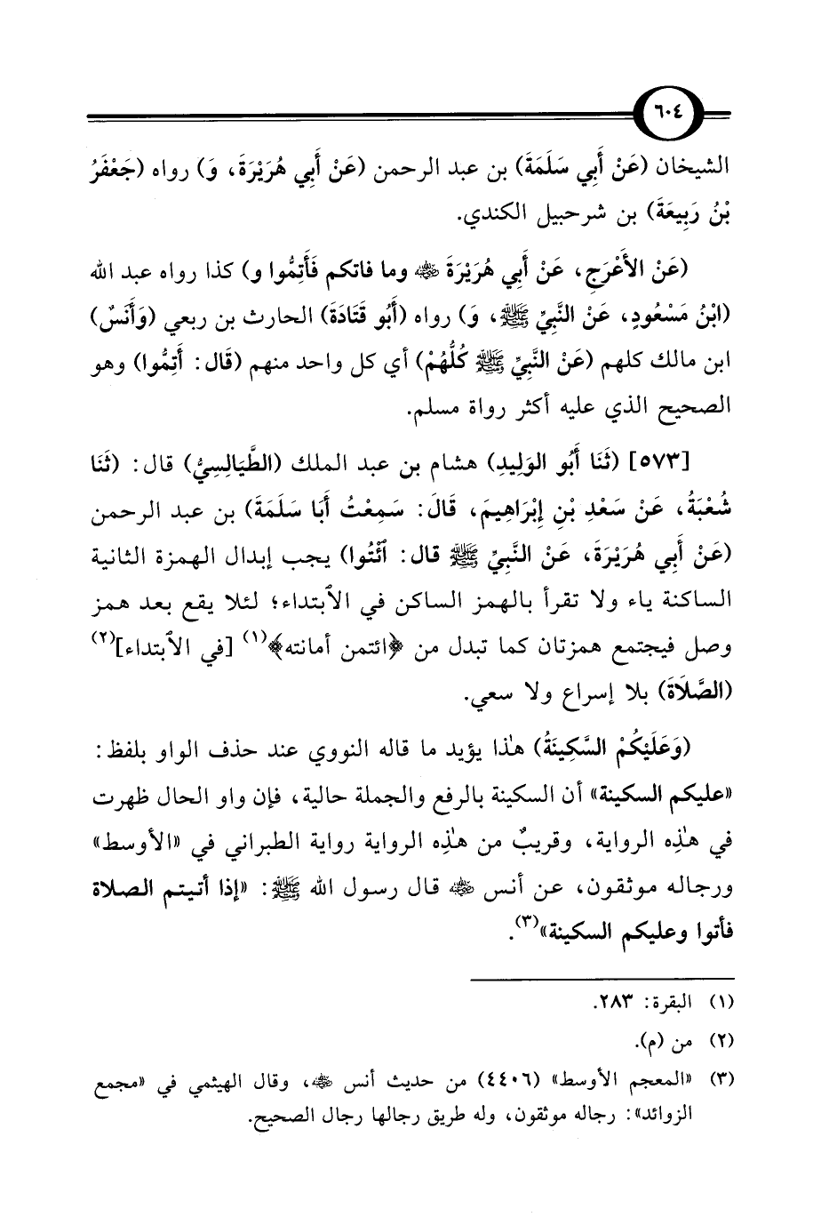 [573] (ثَنَا أَبُو الوَلِيدِ) هشام بن عبد الملك (الطَّيَالِسِيُّ) قال: (ثَنَا شُعْبَةُ، عَنْ سَعْدِ بْنِ إِبْرَاهِيمَ، قَال: سَمِعْتُ أَبَا سَلَمَةَ) بن عبد الرحمن (عَنْ أَبِي هُرَيْرَةَ، عَنْ النَّبِيِّ - صلى الله عليه وسلم - قال: ائْتُوا) يجب إبدال الهمزة الثانية الساكنة ياء ولا تقرأ بالهمز الساكن في الابتداء؛ لئلا يقع بعد همز وصل فيجتمع همزتان كما تبدل من {اؤْتُمِنَ أَمَانَتَهُ} (¬1) [في الابتداء] (¬2) (الصَّلَاةَ) بلا إسراع ولا سعي.