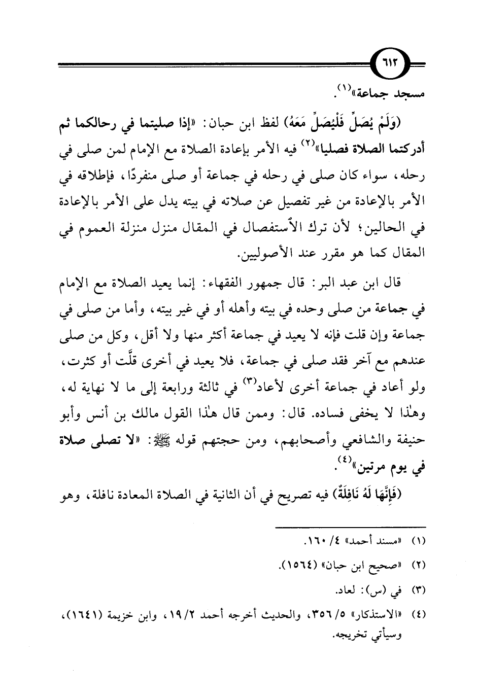(وَلَمْ يُصَلِّ فَلْيُصَلِّ مَعَهُ) لفظ ابن حبان: "إذا صليتما في رحالكما ثم أدركتما الصلاة فصليا" (¬2) فيه الأمر بإعادة الصلاة مع الإمام لمن صلى في رحله، سواء كان صلى في رحله في جماعة أو صلى منفردًا، فإطلاقه في الأمر بالإعادة من غير تفصيل عن صلاته في بيته يدل على الأمر بالإعادة في الحالين؛ لأن ترك الاستفصال في المقال منزل منزلة العموم في المقال كما هو مقرر عند الأصوليين.
