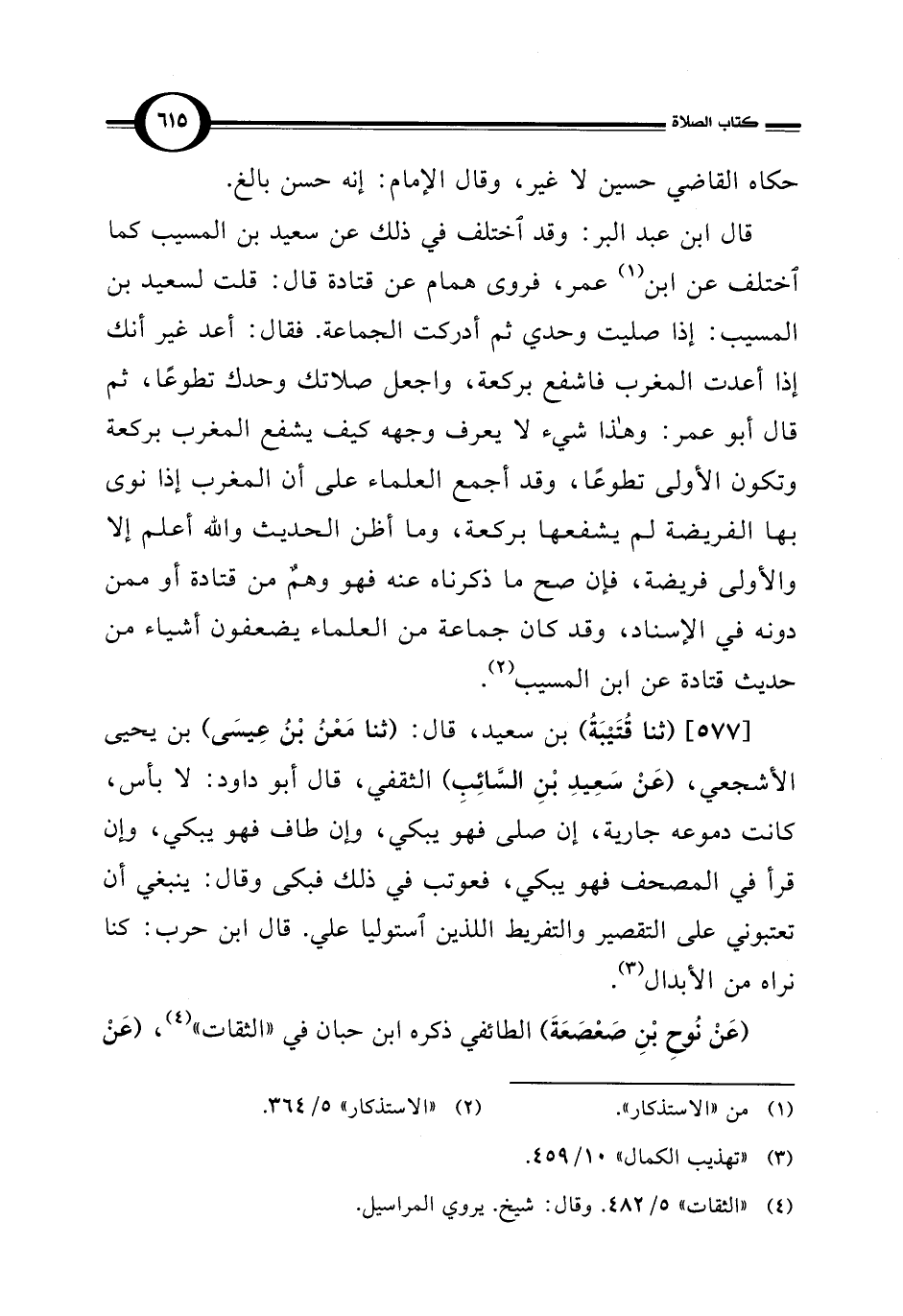 [577] (ثنا قُتَيْبَةُ) بن سعيد، قال: (ثنا مَعْنُ بْنُ عِيسَى) بن يحيى الأشجعي، (عَنْ سَعِيدِ بْنِ السَّائِبِ) الثقفي، قال أبو داود: لا بأس، كانت دموعه جارية، إن صلى فهو يبكي، وإن طاف فهو يبكي، وإن قرأ في المصحف فهو يبكي، فعوتب في ذلك فبكى وقال: ينبغي أن تعتبوني على التقصير والتفريط اللذين استوليا علي. قال ابن حرب: كنا نراه من الأبدال (¬3).