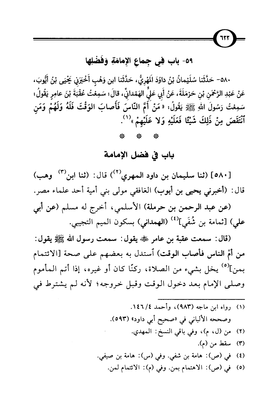 580 - حَدَّثَنا سُلَيْمانُ بْنُ داوُدَ المهْرِيُّ، حَدَّثَنا ابن وَهْبٍ أَخْبَرَنِي يَحْيَى بْنُ أَيُّوبَ، عَنْ عَبْدِ الرَّحْمَنِ بْنِ حَرْمَلَةَ، عَنْ أَبِي عَلِيٍّ الهَمْدانيِّ، قال: سَمِعْتُ عُقْبَةَ بْنَ عامِرٍ يَقُولُ: سَمِعْتُ رَسُولَ الله - صلى الله عليه وسلم - يَقُولُ: "مَنْ أَمَّ النّاسَ فَأَصابَ الوَقْتَ فَلَهُ وَلَهُمْ وَمَنِ انْتَقَصَ مِنْ ذَلِكَ شَيْئًا فَعَلَيْهِ وَلا عَلَيْهِمْ" (¬1).