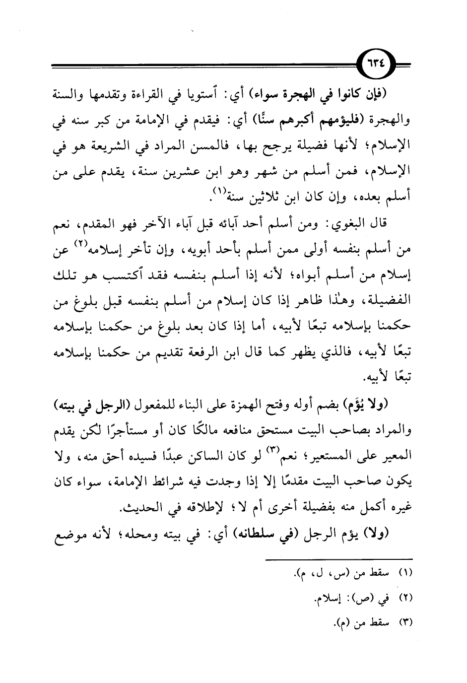 (ولا يُؤَم) بضم أوله وفتح الهمزة على البناء للمفعول (الرجل في بيته) والمراد بصاحب البيت مستحق منافعه مالكًا كان أو مستأجرًا لكن يقدم المعير على المستعير؛ نعم (¬3) لو كان الساكن عبدًا فسيده أحق منه، ولا يكون صاحب البيت مقدمًا إلا إذا وجدت فيه شرائط الإمامة، سواء كان غيره أكمل منه بفضيلة أخرى أم لا؛ لإطلاقه في الحديث.