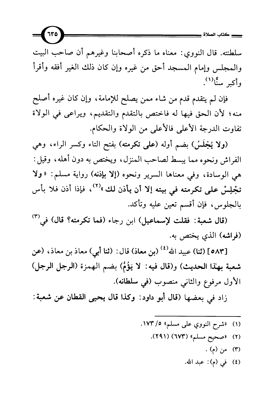 سلطنته. قال النووي: معناه ما ذكره أصحابنا وغيرهم أن صاحب البيت والمجلس وإمام المسجد أحق من غيره وإن كان ذلك الغير أفقه وأقرأ وأكبر سنًّا (¬1).