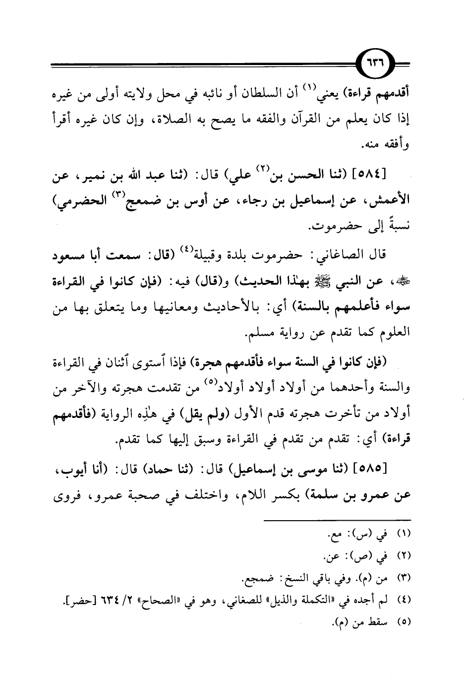 [584] (ثنا الحسن بن (¬2) علي) قال: (ثنا عبد الله بن نمير، عن الأعمش، عن إسماعيل بن رجاء، عن أوس بن ضمعج (¬3) الحضرمي) نسبةً إلى حضرموت.