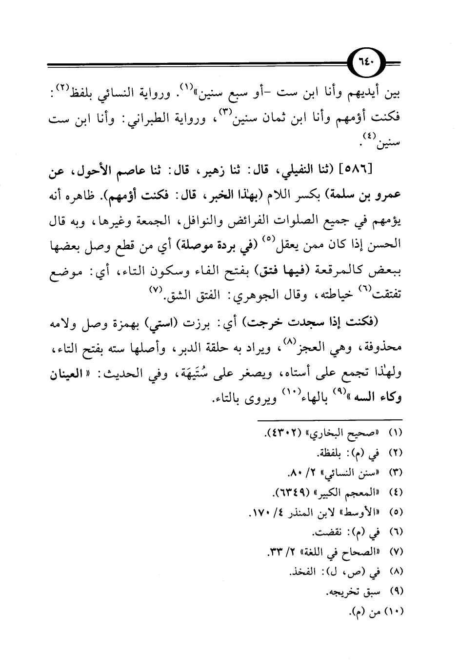 [586] (ثنا النفيلي، قال: ثنا زهير، قال: ثنا عاصم الأحول، عن عمرو بن سلمة) بكسر اللام (بهذا الخبر، قال: فكنت أؤمهم). ظاهره أنه يؤمهم في جميع الصلوات الفرائض والنوافل، الجمعة وغيرها، وبه قال الحسن إذا كان ممن يعقل (¬5) (في بردة موصلة) أي من قطع وصل بعضها ببعض كالمرقعة (فيها فتق) بفتح الفاء وسكون التاء، أي: موضع تفتقت (¬6) خياطته، وقال الجوهري: الفتق الشق. (¬7)