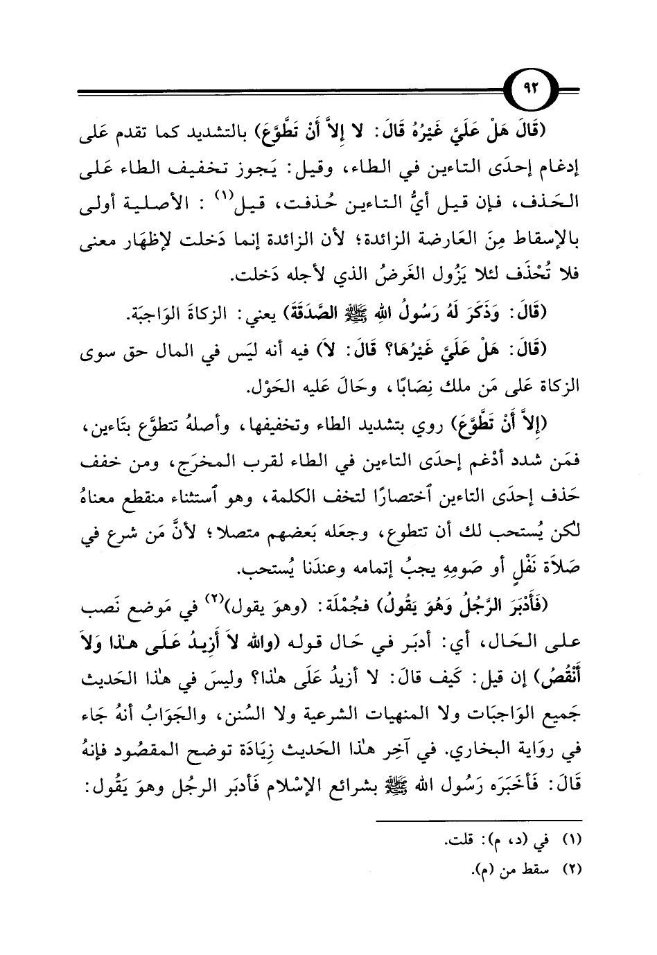 (قَالَ هَلْ عَلَيَّ غَيرُهُ قَالَ: لا إِلَّا أَنْ تَطَّوَّعَ) بالتشديد كما تقدم عَلى إدغام إحدَى التاءين في الطاء، وقيل: يَجوز تخفيف الطاء عَلى الحَذف، فإن قيل أيُّ التاءين حُذفت، قيل (¬1): الأصلية أولى بالإسقاط مِنَ العَارضة الزائدة؛ لأن الزائدة إنما دَخلت لإظهَار معنى فلا تُحْذَف لئلا يَزُول الغَرضُ الذي لأجله دَخلت.