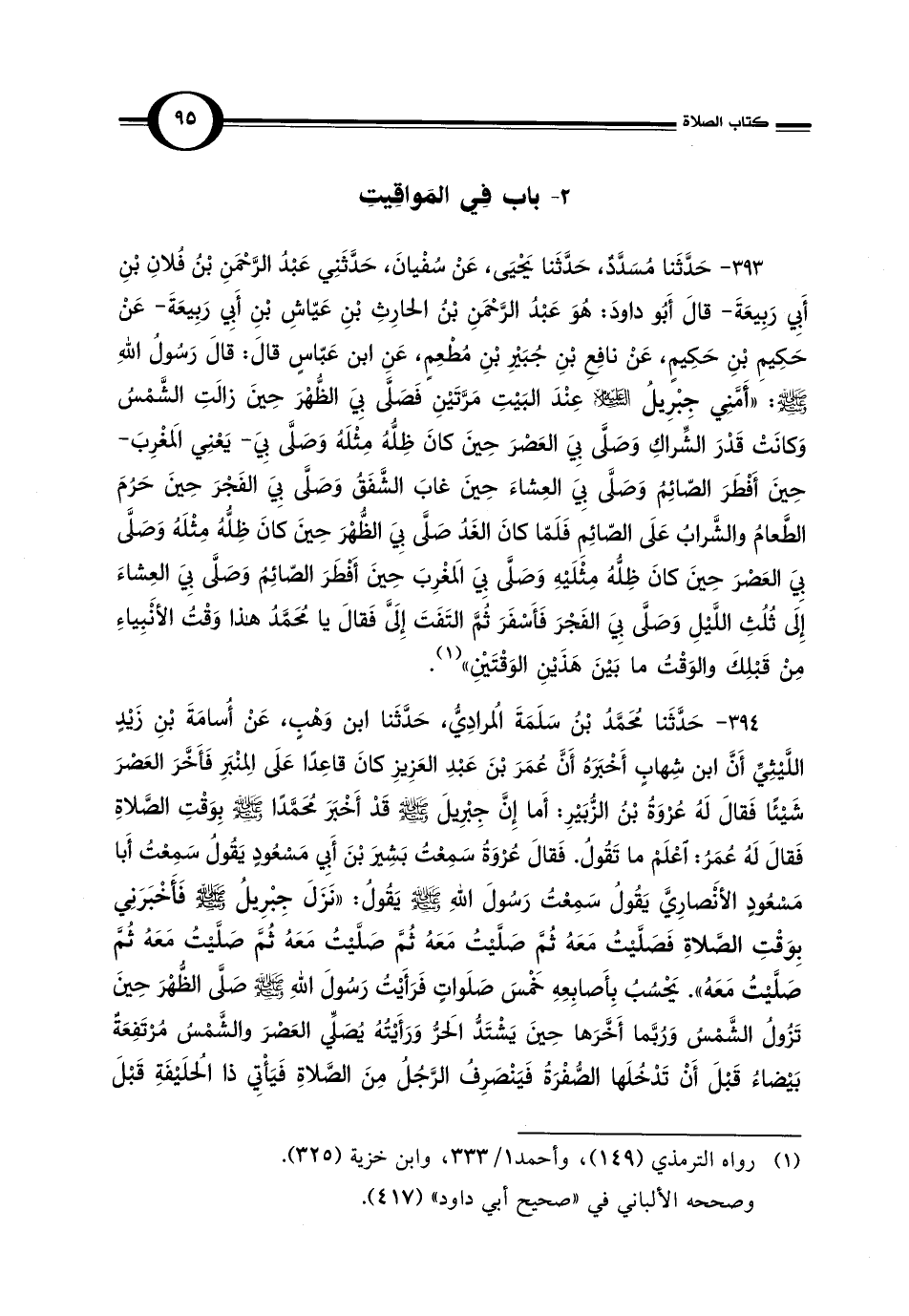 313 - حَدَّثَنا مُسَدَّدٌ، حَدَّثَنا يَحْيَى، عَنْ سُفْيانَ، حَدَّثَنِي عَبْدُ الرَّحْمَنِ بْنُ فلانِ بْنِ أَبِي رَبِيعَةَ -قالَ أَبُو داودَ: هُوَ عَبْدُ الرَّحْمَنِ بْنُ الحارِثِ بْنِ عَيّاشِ بْنِ أَبِي رَبِيعَةَ- عَنْ حَكِيمِ بْنِ حَكِيمٍ، عَنْ نافِعِ بْنِ جُبَيْرِ بْنِ مُطْعِيمٍ، عَنِ ابن عَبّاسٍ قالَ: قالَ رَسُولُ اللهِ - صلى الله عليه وسلم -: "أَمَّنِي جِبْرِيلُ عليه السلام عِنْدَ البَيْتِ مَرَّتَيْنِ فَصَلَّى بِيَ الظُّهْرَ حِينَ زالَتِ الشَّمْسُ وَكانَتْ قَدْرَ الشِّراكِ وَصَلَّى بِيَ العَصْرَ حِينَ كانَ ظِلُّة مِثْلَهُ وَصَلَّى بِيَ -يَعْنِي المَغْرِبَ- حِينَ أَفْطَرَ الصّائِمُ وَصَلَّى بِيَ العِشاءَ حِينَ غابَ الشَّفَقُ وَصَلَّى بِيَ الفَجْرَ حِينَ حَرُمَ الطَّعامُ والشَّرابُ عَلَى الصّائِمِ فَلَمّا كانَ الغَدُ صَلَّى بِيَ الظُّهْرَ حِينَ كانَ ظِلُّهُ مِثْلَهُ وَصَلَّى بِيَ العَصْرَ حِينَ كانَ ظِلُّهُ مِثْلَيْهِ وَصَلَّى بِيَ الَمغْرِبَ حِينَ أَفْطَرَ الصّائِمُ وَصَلَّى بِيَ العِشاءَ إِلَى ثُلُثِ اللَّيْلِ وَصَلَّى بِيَ الفَجْرَ فَأَسْفَرَ ثُمَّ التَفَتَ إِلَيَّ فَقالَ يا مُحَمَّد هذا وَقْتُ الأَنْبِياءِ مِنْ قَبْلِكَ والوَقْتُ ما بَيْنَ هَذَيْنِ الوَقْتَيْنِ" (¬1).