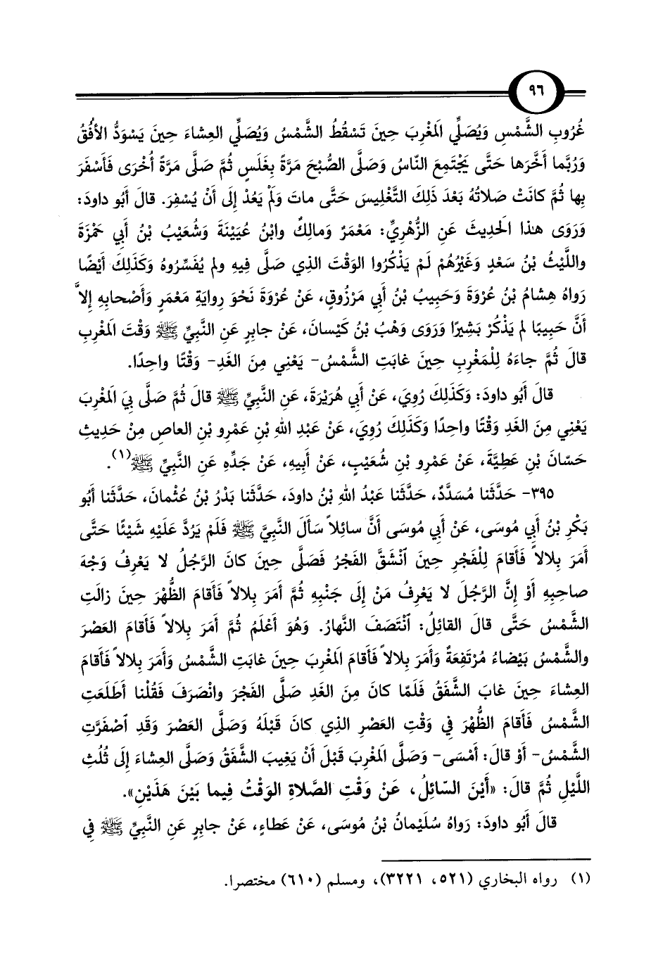 غُرُوبِ الشَّمْسِ وَيُصَلِّي المَغْرِبَ حِينَ تَسْقُطُ الشَّمْسُ وَيُصَلِّي العِشاءَ حِينَ يَسْوَدُّ الأُفُقُ وَرُبَّما أَخَّرَها حَتَّى يَجْتَمِعَ النّاسُ وَصَلَّى الصُّبْحَ مَرَّةً بِغَلَسٍ ثُمَّ صَلَّى مَرَّةً أخرَى فَأَسْفَرَ بِها ثُمَّ كانَتْ صَلاتُهُ بَعْدَ ذَلِكَ التَّغْلِيسَ حَتَّى ماتَ وَلَمْ يَعُدْ إِلَى أَنْ يُسْفِرَ. قالَ أَبُو داودَ: وَرَوَى هذا الحَدِيثَ عَنِ الزُّهْرِيِّ: مَعْمَرٌ وَمالِكٌ وابْنُ عُيَيْنَةَ وَشُعَيْبُ بْنُ أَبِي حَمْزَةَ واللَّيْثُ بْنُ سَعْدٍ وَغَيْرُهُمْ لَمْ يَذْكُرُوا الوَقْتَ الذِي صَلَّى فِيهِ ولم يفَسِّرُوهُ وَكَذَلِكَ أَيْضًا رَواة هِشامُ بْنُ عُرْوَةَ وَحَبِيبُ بْنُ أَبِي مَرْزُوقٍ، عَنْ عُرْوَةَ نَحْوَ رِوايَةِ مَعْمَرٍ وَأَصْحابِهِ إِلَّا أَنَّ حَبِيبًا لم يَذْكُرْ بَشِيرًا وَرَوَى وَهْبُ بْنُ كَيْسانَ، عَنْ جابِرٍ عَنِ النَّبِيِّ - صلى الله عليه وسلم - وَقْتَ الَمغْرِبِ قالَ ثمَّ جاءَهُ لِلْمَغْرِبِ حِينَ غابَتِ الشَّمْسُ -يَعْنِي مِنَ الغَدِ- وَقْتًا واحِدًا.