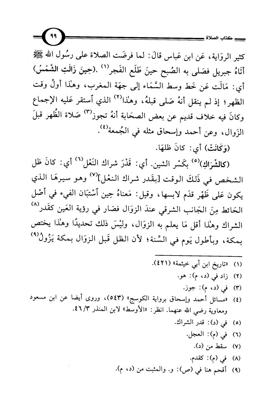 (كالشِّرَاكِ) (¬5) بكَسْر الشين. أي: قَدْرَ شراك النَعْل (¬6) أي: كانَ ظل الشخص في ذَلكَ الوقت [بقَدر شراك النعْل] (¬7) وهو سيرهَا الذي يكون عَلى ظَهْر قدَم لابسها، وقيل: مَعناهُ حِين اسْتبَان الفيء في أصْل الحَائط مِنَ الجَانب الشرقي عندَ الزوَال فصَار في رؤية العَين كقَدر (¬8) الشراك وهذا أقل مَا يعلم به الزوَال، وليْسَ ذلك تحديدًا وهذا يختص بمكة، وبأطول يَوم في السَّنة؛ لأن الظل قَبل الزوَال بمكة يَزُولُ (¬9)