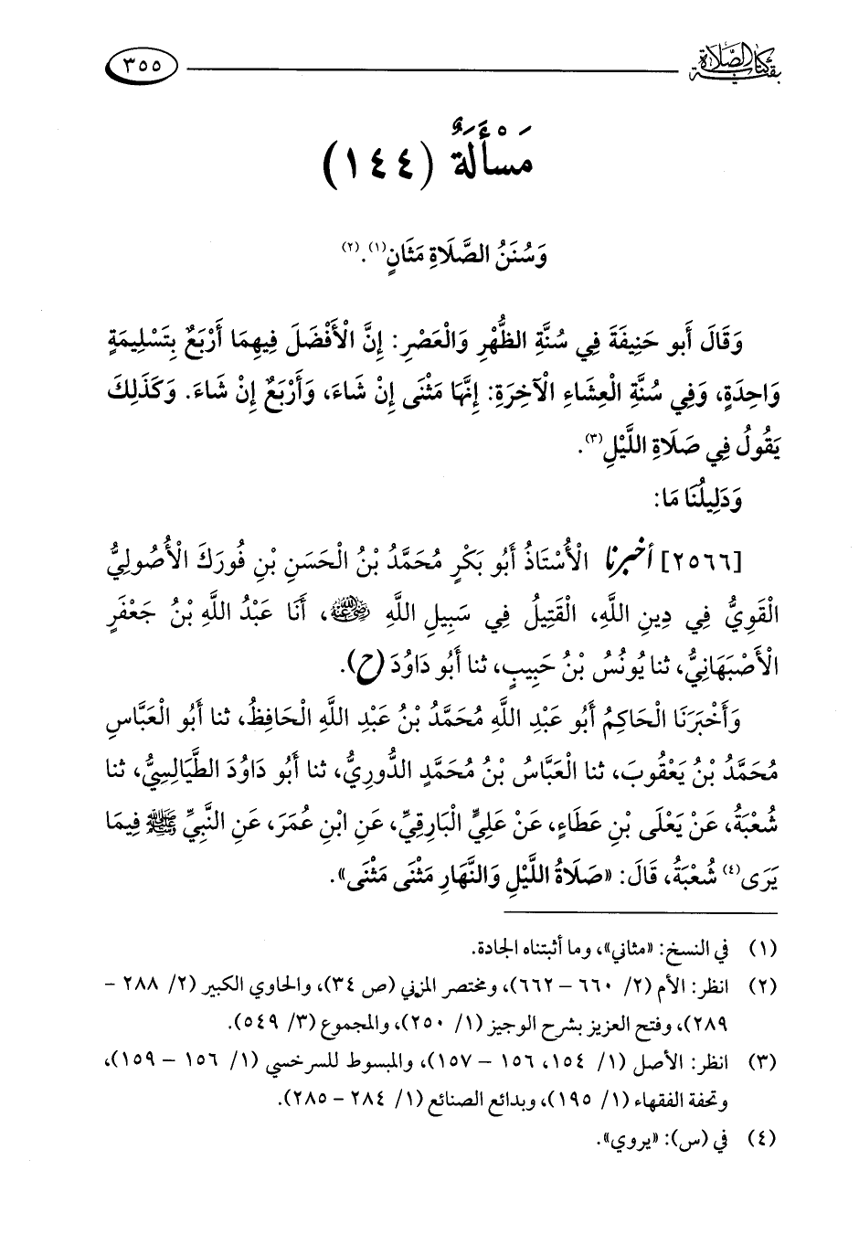 مَسْأَلَةٌ (144): وَسُنَنُ الصَّلَاةِ مَثَانٍ (¬1). (¬2)