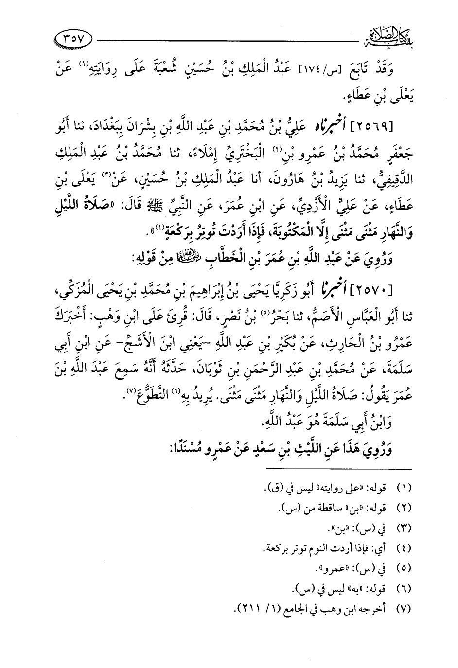 [2570] أخبرنا أَبُو زَكَرِيَّا يَحْيَى بْنُ إِبْرَاهِيمَ بْنِ مُحَمَّدِ بْنِ يَحْيَى الْمُزَكِّي، ثنا أَبُو الْعَبَّاسِ الْأَصَمُّ، ثنا بَحْرُ (¬5) بْنُ نَصْرٍ، قَالَ: قُرِئَ عَلَى ابْنِ وَهْبٍ: أَخْبَرَكَ عَمْرُو بْنُ الْحَارِثِ، عَنْ بُكَيْرِ بْنِ عَبْدِ اللَّهِ - يَعْنِي ابْنَ الْأَشَجِّ - عَنِ ابْنِ أَبِي سَلَمَةَ، عَنْ مُحَمَّدِ بْنِ عَبْدِ الرَّحْمَنِ بْنِ ثَوْبَانَ، حَدَّثَهُ أَنَّهُ سَمِعَ عَبْدَ اللَّهِ بْنَ عُمَرَ يَقُولُ: صَلَاةُ اللَّيْلِ وَالنَّهَارِ مَثْنَى مَثْنَى. يُرِيدُ بِهِ (¬6) التَّطَوُّعَ (¬7).