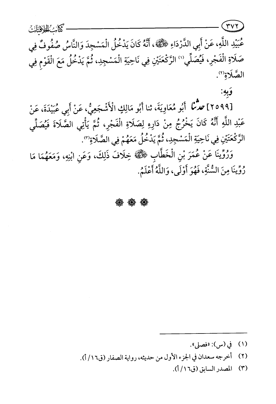[2599] حدثنا أَبُو مُعَاوِيَةَ، ثنا أَبُو مَالِكٍ الْأَشْجَعِيُّ، عَنْ أَبِي عُبَيْدَةَ، عَنْ عَبْدِ اللَّهِ أَنَّهُ كَانَ يَخْرُجُ مِنْ دَارِهِ لِصَلَاةِ الْفَجْرِ، ثُمَّ يَأْتِي الصَّلَاةَ فَيُصَلَّي الرَّكْعَتَيْنِ فِي نَاحِيَةِ الْمَسْجِدِ، ثُمَّ يَدْخُلُ مَعَهُمْ فِي الصَّلَاةِ (¬3).