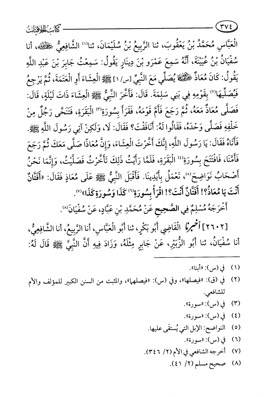 الْعَبَّاسِ مُحَمَّدُ بْنُ يَعْقُوبَ، ثنا الرَّبِيعُ بْنُ سُلَيْمَانَ، ثنا (¬1) الشَّافِعِيُّ - رحمه الله -، أنا سُفْيَانُ بْنُ عُيَيْنَةَ، أَنَّهُ سَمِعَ عَمْرَو بْنَ دِينَارٍ يَقُولُ: سَمِعْتُ جَابِرَ بْنَ عَبْدِ اللَّهِ يَقُولُ: كَانَ مُعَاذٌ - رضي الله عنهما - يُصَلِّي مَعَ النَّبِيِّ - صلى الله عليه وسلم - الْعِشَاءَ أَوِ الْعَتَمَةَ، ثُمَّ يَرْجِعُ فَيُصَلِّيهَا (¬2) بِقَوْمِهِ فِي بَنِي سَلِمَةَ. قَالَ: فَأَخَّرَ النَّبِيُّ - صلى الله عليه وسلم - الْعِشَاءَ ذَاتَ لَيْلَةٍ، قَالَ: فَصَلَّى مُعَاذٌ مَعَهُ، ثُمَّ رَجَعَ فَأَمَّ قَوْمَهُ، فَقَرَأَ بِسُورَةِ (¬3) الْبَقَرَةِ، فَتَنَحَّى رَجُلٌ مِنْ خَلْفِهِ فَصَلَّى وَحْدَهُ، فَقَالُوا لَهُ: أَنَافَقْتَ؟ فَقَالَ: لَا، وَلَكِنْ آتِي رَسُولَ اللَّهِ - صلى الله عليه وسلم -. فَأَتَاهُ فَقَالَ: يَا رَسُولَ اللَّهِ، إِنَّكَ أَخَّرْتَ الْعِشَاءَ، وَإِنَّ مُعَاذًا صَلَّى مَعَكَ ثُمَّ رَجَعَ فَأَمَّنَا، فَافْتَتَحَ بِسُورَةِ (¬4) الْبَقَرَةِ، فَلَمَّا رَأَيْتُ ذَلِكَ تَأَخَّرْتُ فَصَلَّيْتُ، وَإِنَّمَا نَحْنُ أَصْحَابُ نَوَاضِحَ (¬5)، نَعْمَلُ بِأَيْدِينَا. فَأَقْبَلَ النَّبِيُّ - صلى الله عليه وسلم - عَلَى مُعَاذٍ فَقَالَ: "أَفَتَّانٌ أَنْتَ يَا مُعَاذُ؟ ! أَفَتَّانٌ أَنْتَ؟ ! اقْرَأْ بِسُورَةِ (¬6) كَذَا وَسُورَةِ كَذَا" (¬7).