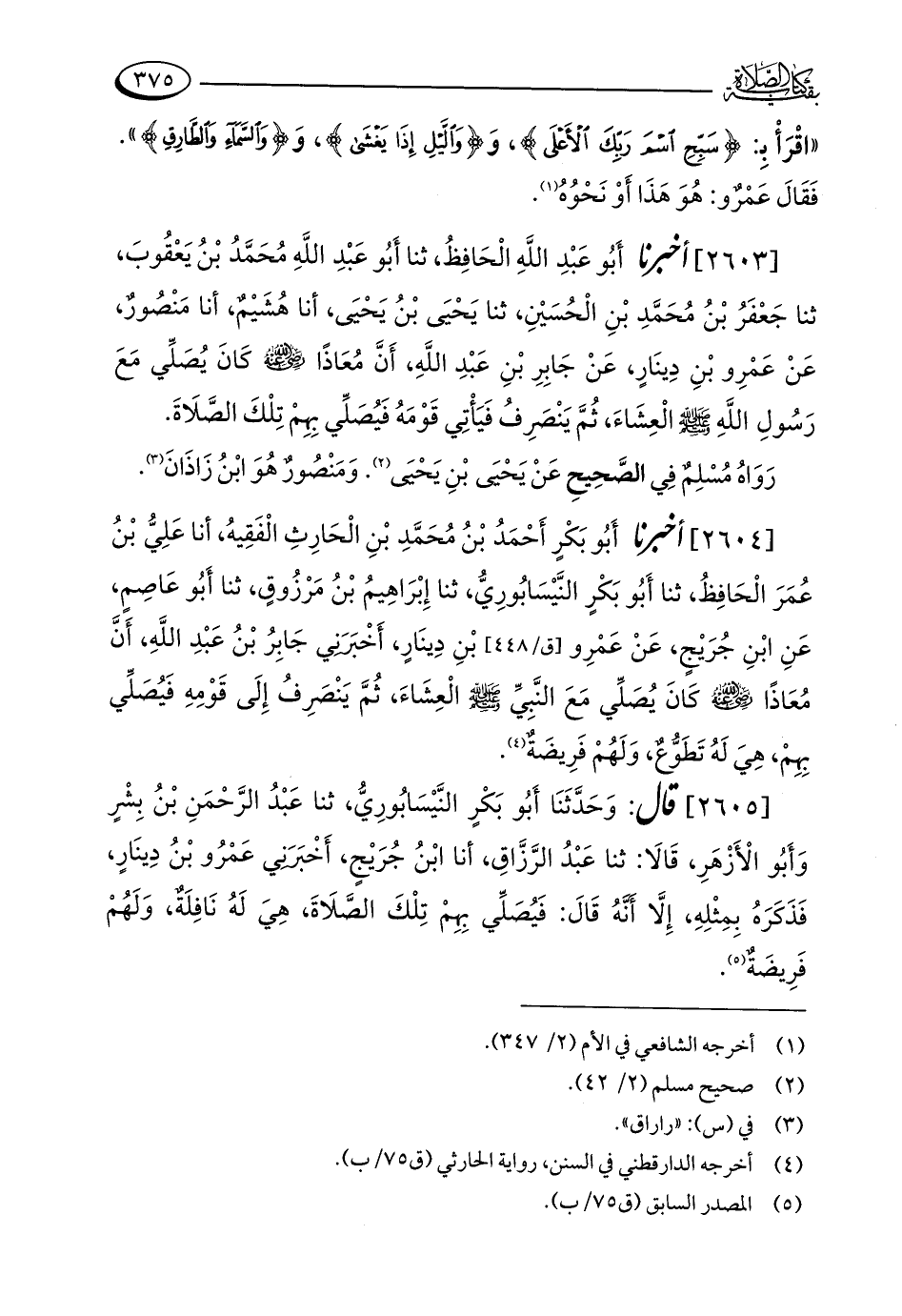 [2604] أخبرنا أَبُو بَكْرٍ أَحْمَدُ بْنُ مُحَمَّدِ بْنِ الْحَارِثِ الْفَقِيهُ، أنا عَلِيُّ بْنُ عُمَرَ الْحَافِظُ، ثنا أَبُو بَكْرٍ النَّيْسَابُورِيُّ، ثنا إِبْرَاهِيمُ بْنُ مَرْزُوقٍ، ثنا أَبُو عَاصِمٍ، عَنِ ابْنِ جُرَيْجٍ، عَنْ عَمْرِو بْنِ دِينَارٍ، أَخْبَرَنِي جَابِرُ بْنُ عَبْدِ اللَّهِ، أَنَّ مُعَاذًا - رضي الله عنه - كَانَ يُصَلِّي مَعَ النَّبِيِّ - صلى الله عليه وسلم - الْعِشَاءَ، ثُمَّ يَنْصرِفُ إِلَى قَوْمِهِ فَيُصَلِّي بِهِمْ، هِيَ لَهُ تَطَوُّعٌ، وَلَهُمْ فَرِيضَةٌ (¬4).