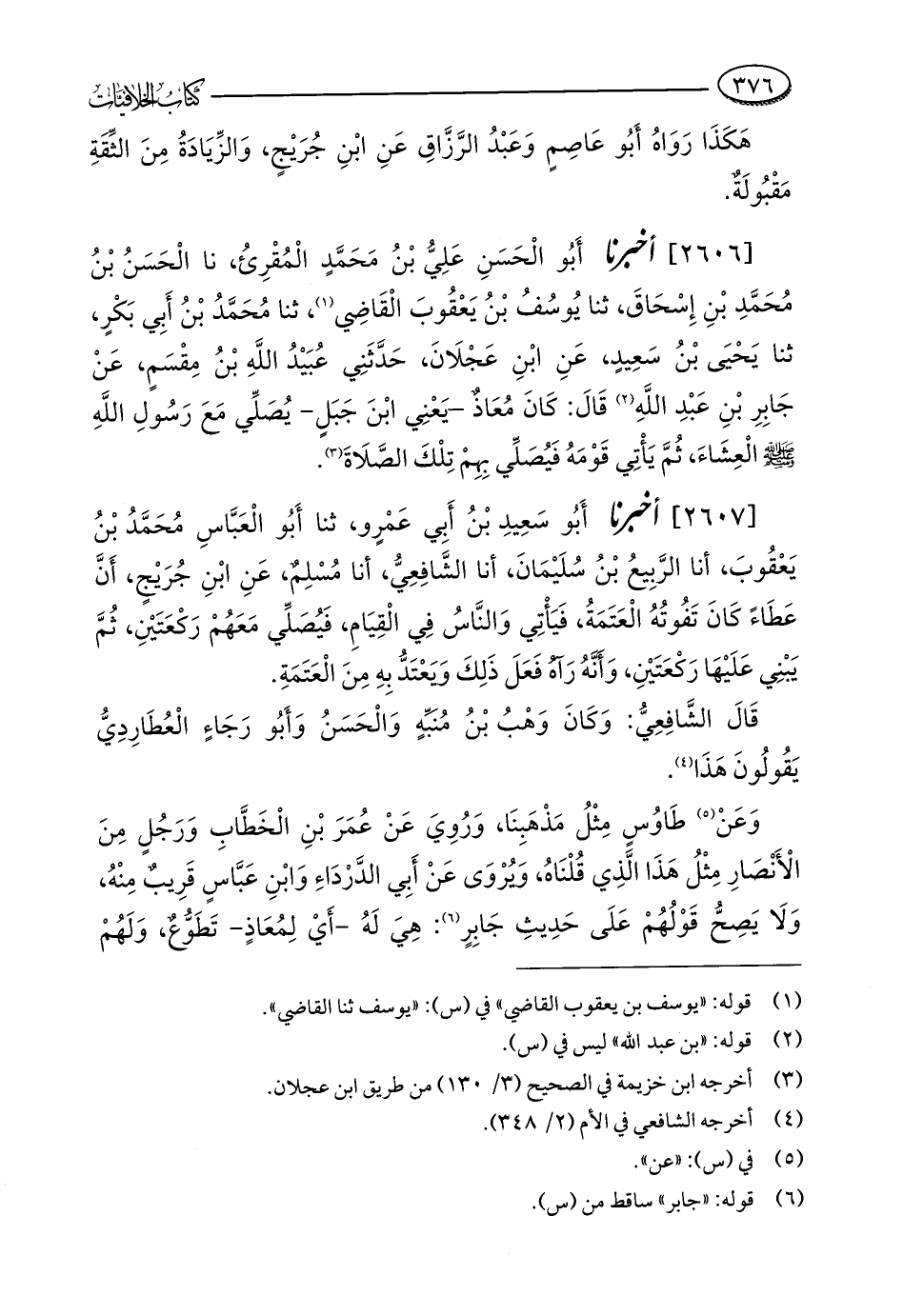 [2607] أخبرنا أَبُو سَعِيدِ بْنُ أَبِي عَمْرٍو، ثنا أَبُو الْعَبَّاسِ مُحَمَّدُ بْنُ يَعْقُوبَ، أنا الرَّبِيعُ بْنُ سُلَيْمَانَ، أنا الشَّافِعِيُّ، أنا مُسْلِمٌ، عَنِ ابْنِ جُرَيْجٍ، أَنَّ عَطَاءً كَانَ تَفُوتُهُ الْعَتَمَةُ، فَيَأْتِي وَالنَّاسُ فِي الْقِيَامِ، فَيُصَلِّي مَعَهُمْ رَكْعَتَيْنِ، ثُمَّ يَبْنِي عَلَيْهَا رَكْعَتَيْنِ، وَأَنَّهُ رَآهُ فَعَلَ ذَلِكَ وَيَعْتَدُّ بِهِ مِنَ الْعَتَمَةِ.